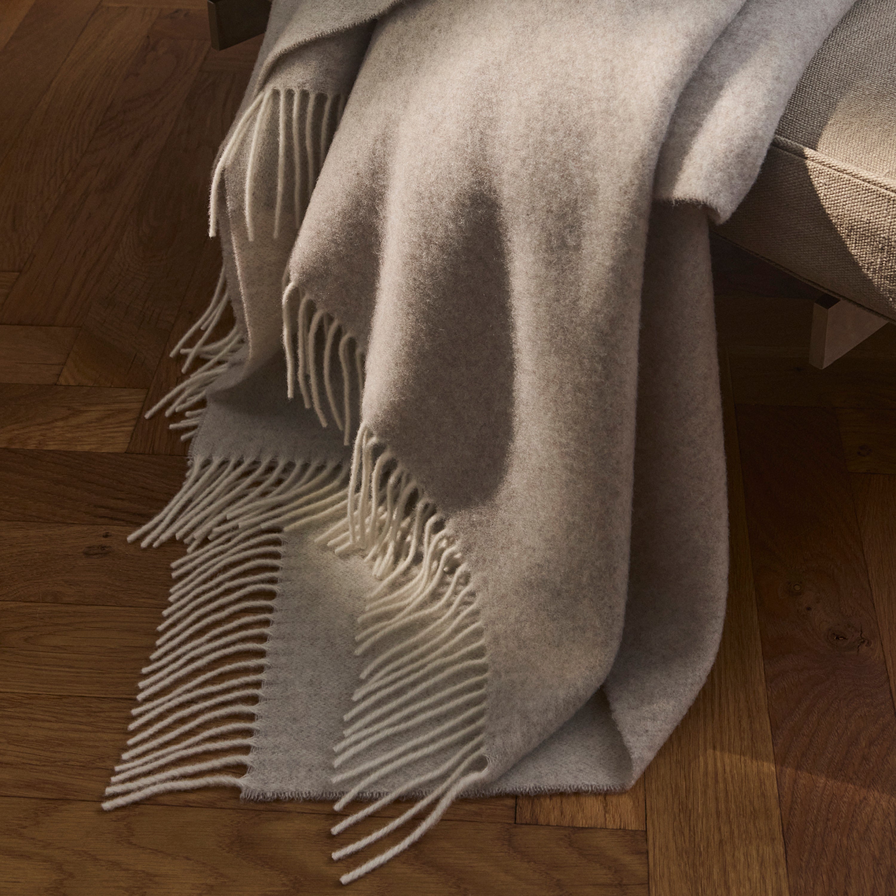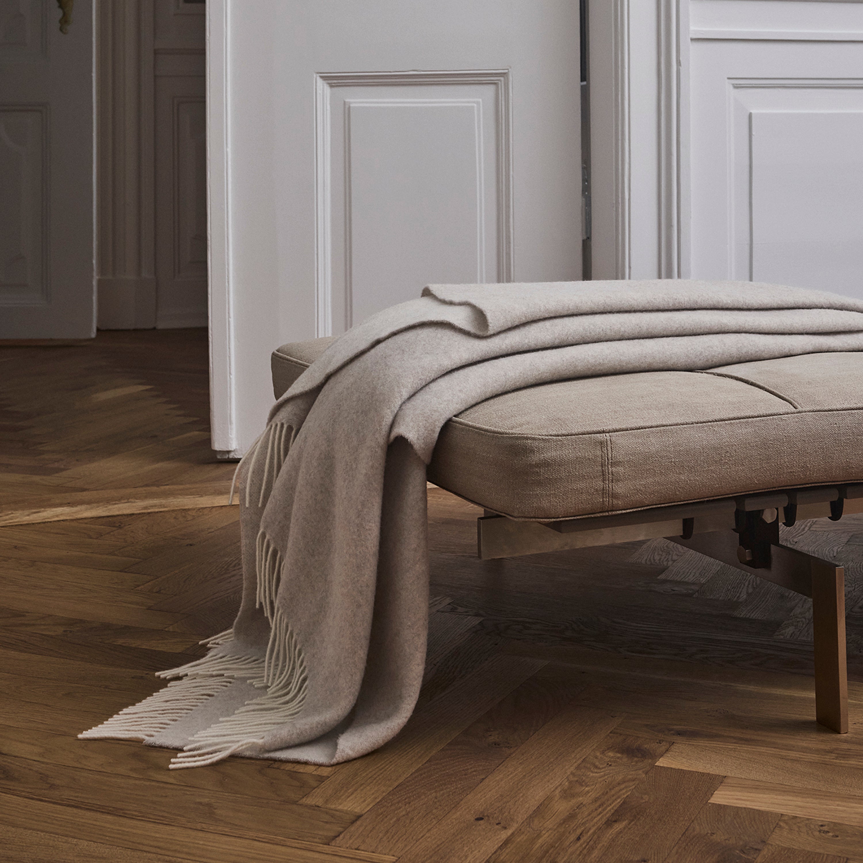 Minimal plaiden er vævet i 90 % merinould og 10 % cashmere. Merinouldens tynde fibre gør det muligt at skabe en meget let plaid med en særlig blødhed fra cashmeren. Den fine uldkombination gør plaiden ekstra lun og behagelig. Med en diskret nuanceforskel på for- og bagside og ecrufarvede frynser har plaiden et klassisk og helt enkelt udtryk.