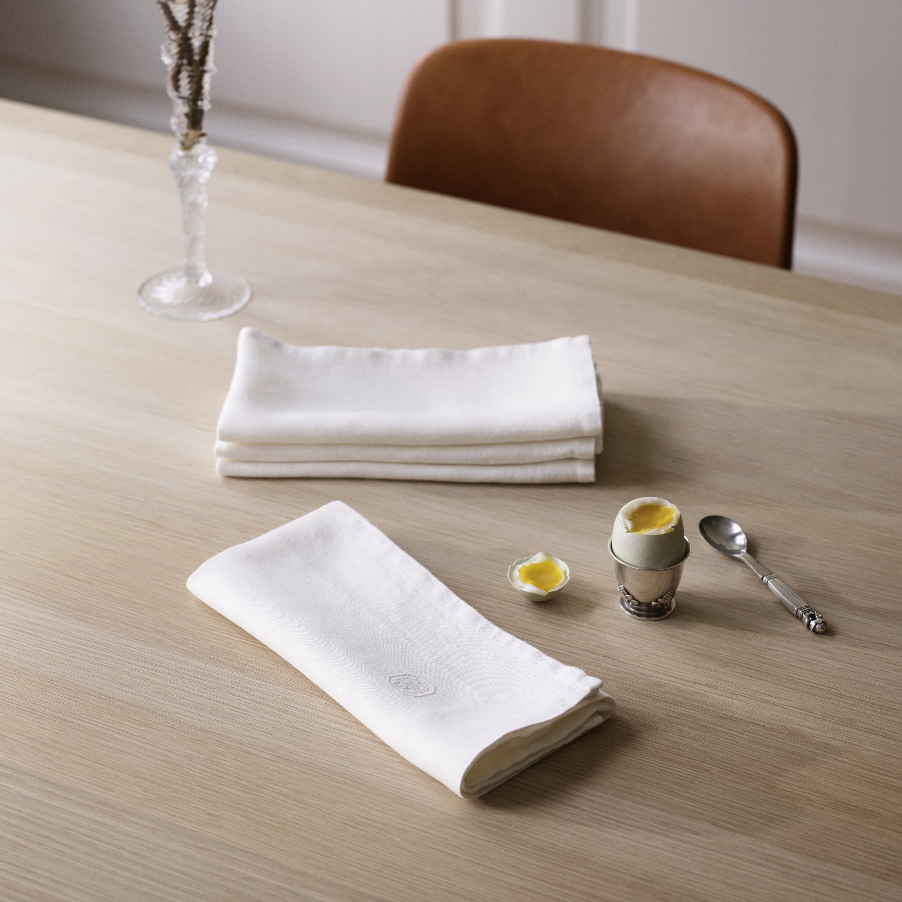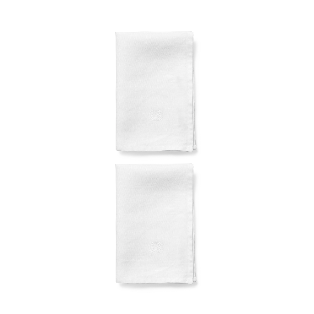 Med sit enkle design er den hvide hørserviet med broderet logo en smuk og raffineret tilføjelse til borddækningen. Den er meget velegnet i en klassisk opdækning, men kan også skabe værdi og være en æstetisk oplevelse i en mere uformel sammenhæng, hvor der dækkes op uden dug. Lige så skøn til store middage som det enkle morgenmåltid eller ved havebordet.