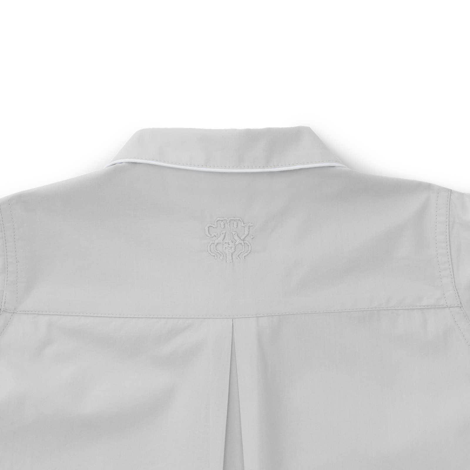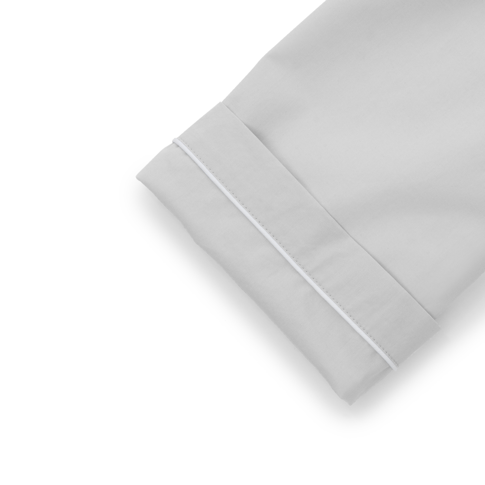 Skjorten har sideslidser, brystlomme, afrundet krave og Georg Jensen Damasks ikoniske logo broderet på bærestykket i nakken. Bukserne har en bred og behagelig elastik i taljen og lommer. Bukse- og ærmelængde kan let tilpasses med et opsmøg, hvor indersiden har en elegant piping.