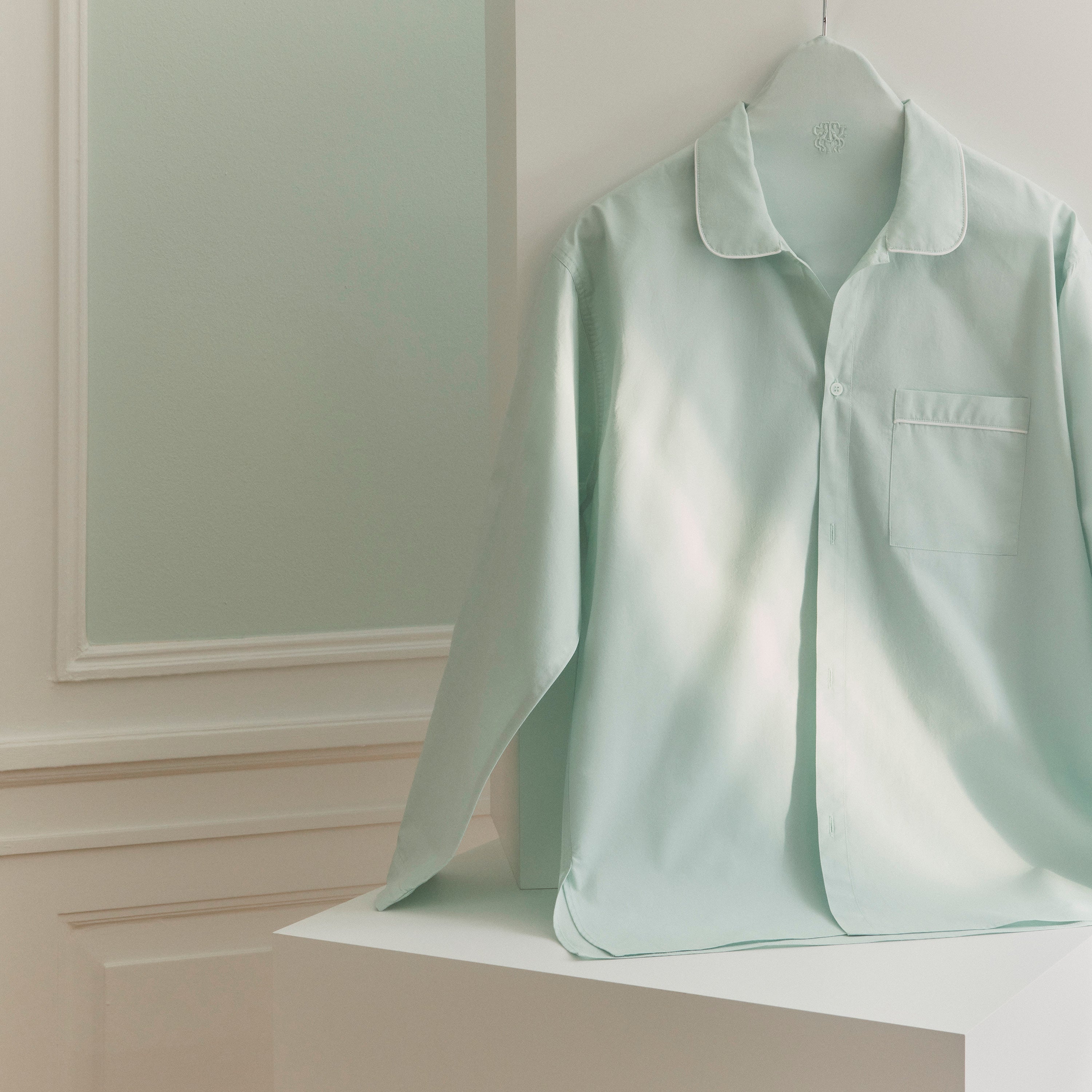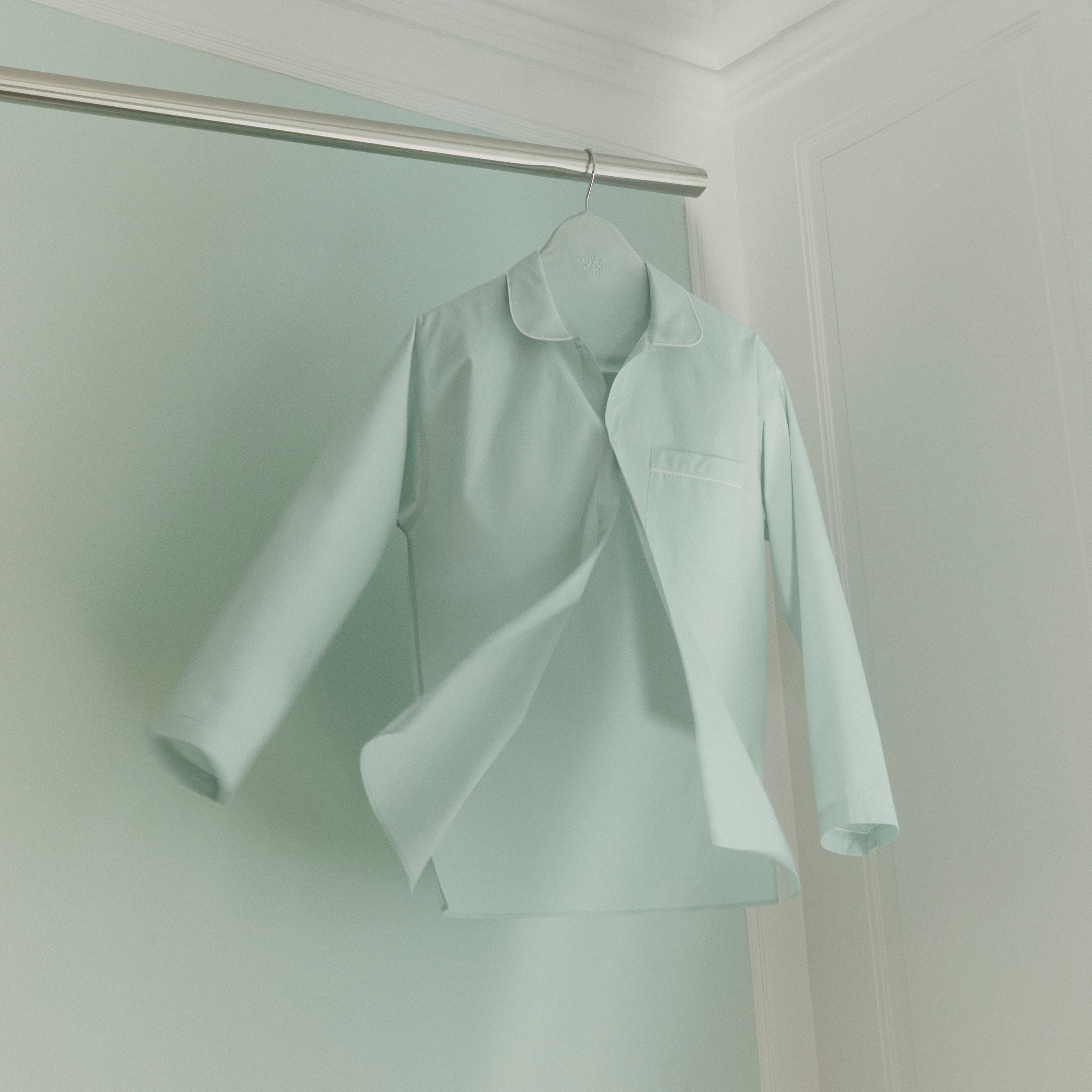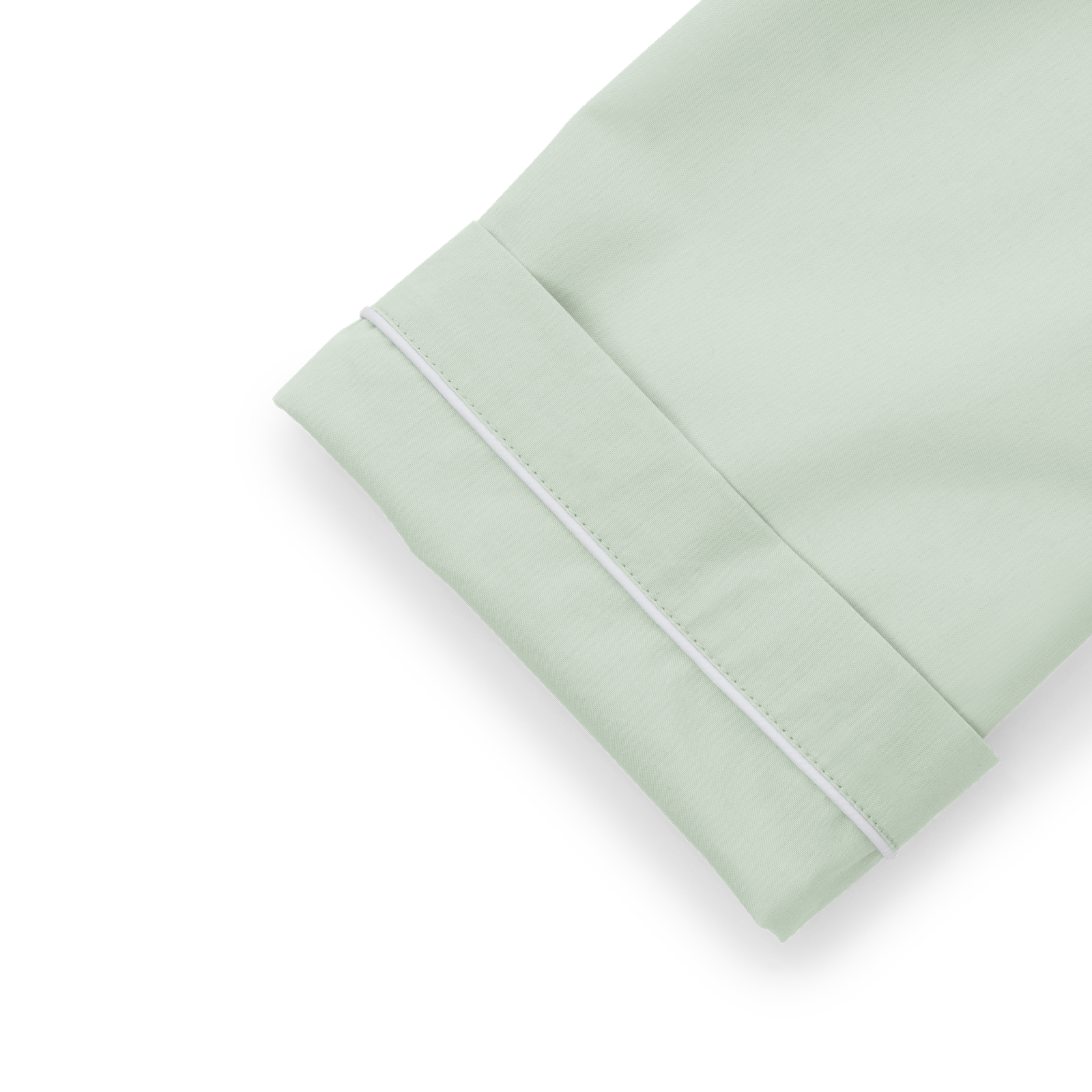 Unisex pyjamas percalevævet i supimabomuld. Pyjamassen har et klassisk snit og elegante, hvide pipings. Den klare, grønblå farve, Glass Green, er inspireret af farven på råglas.