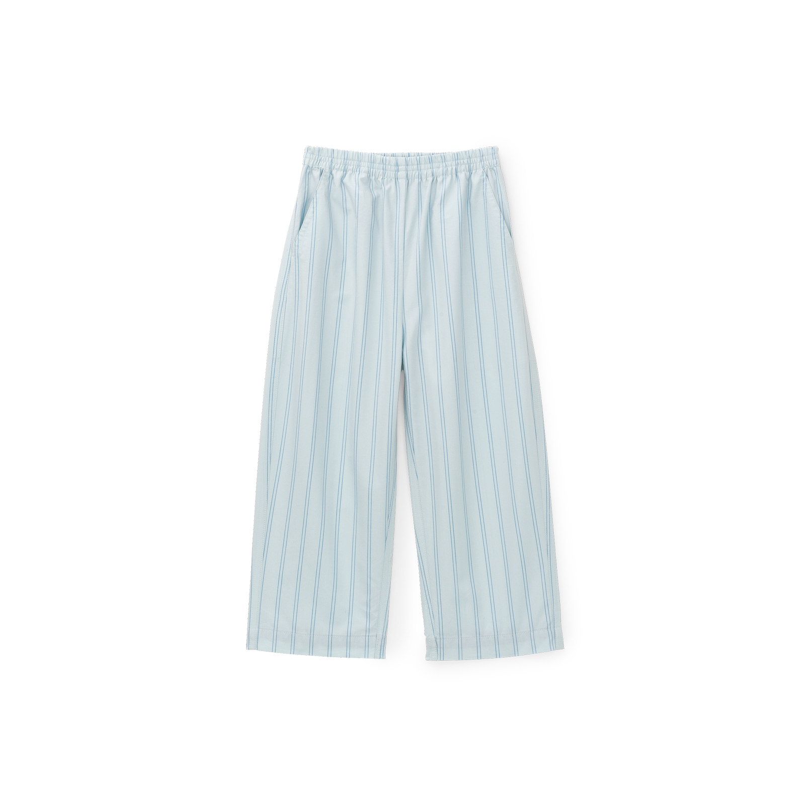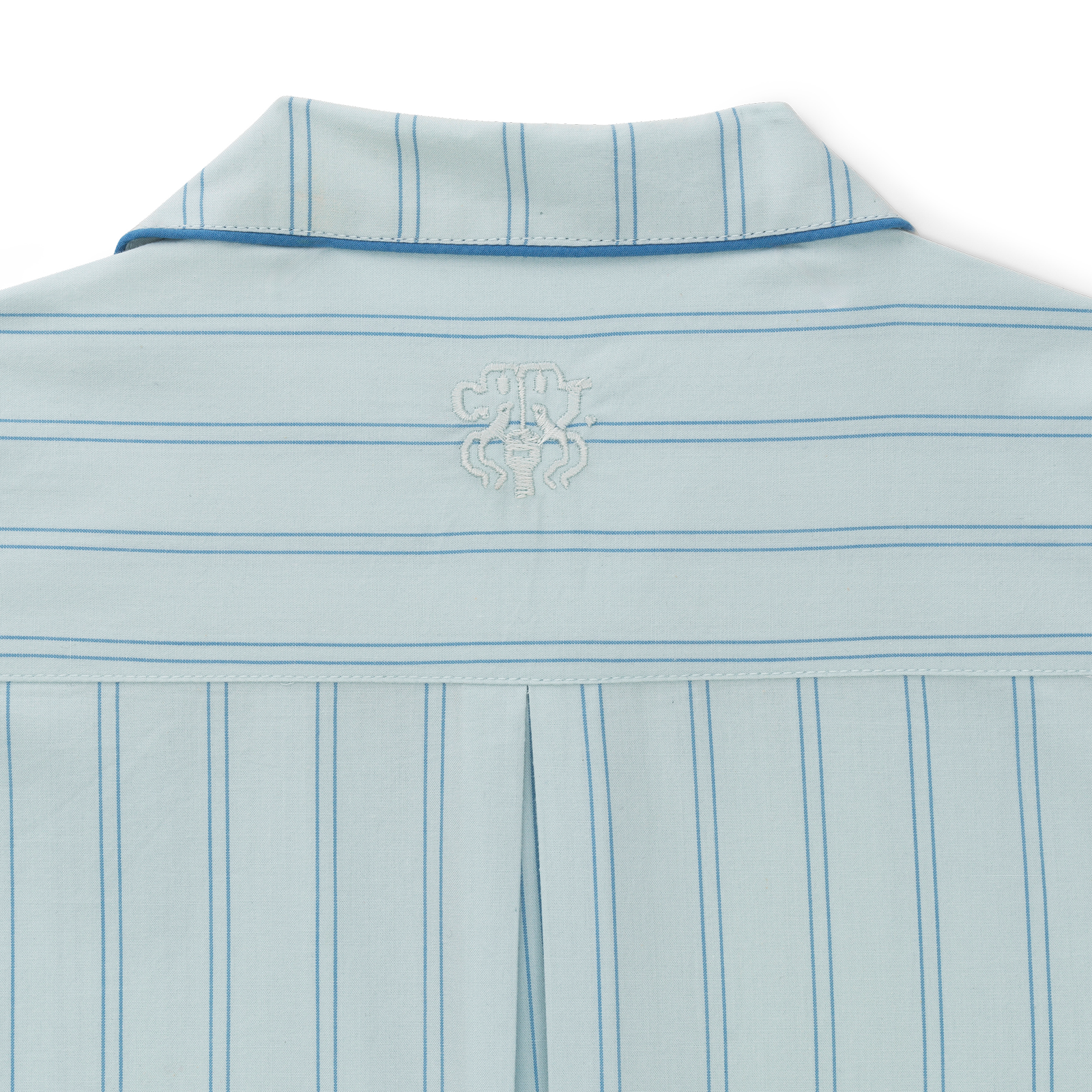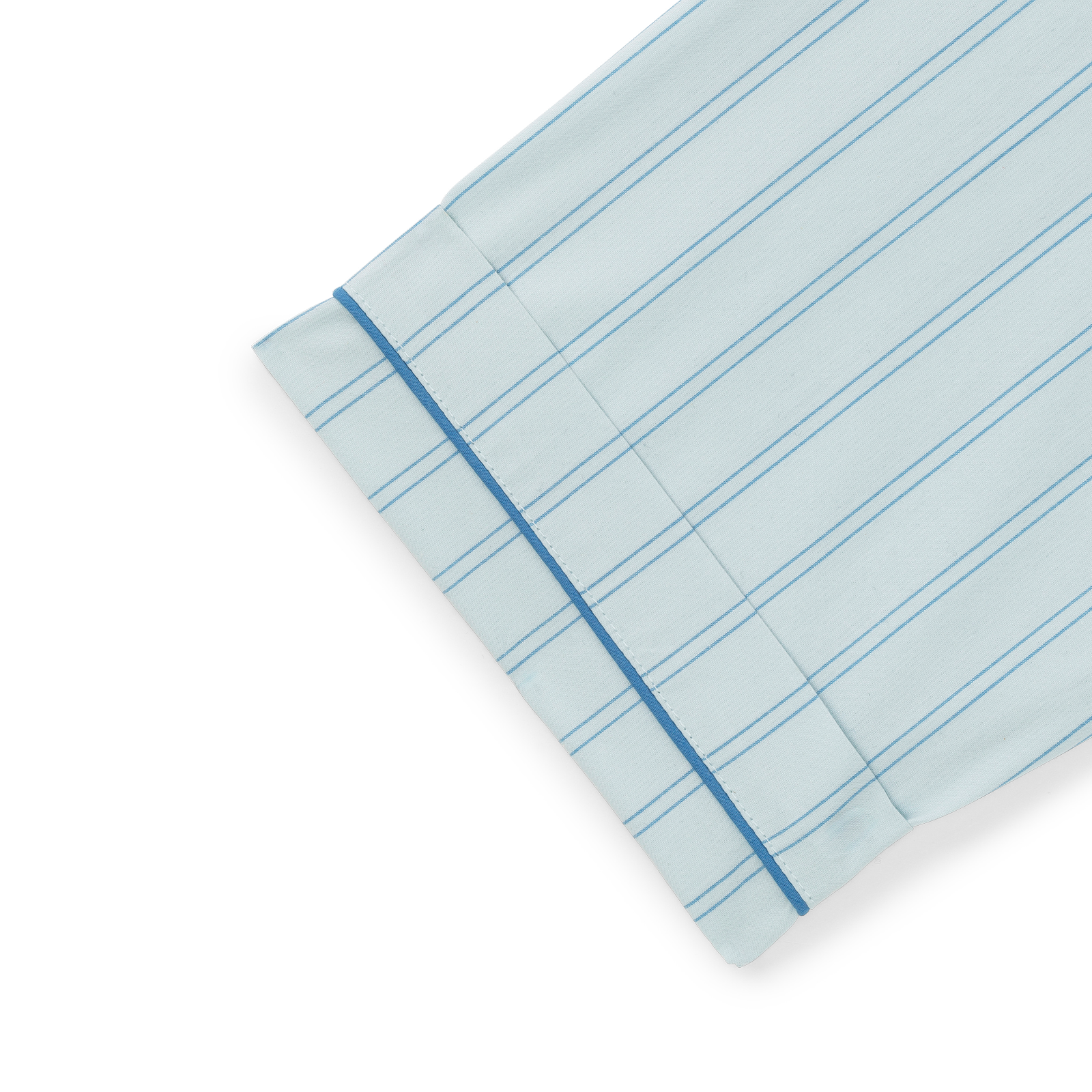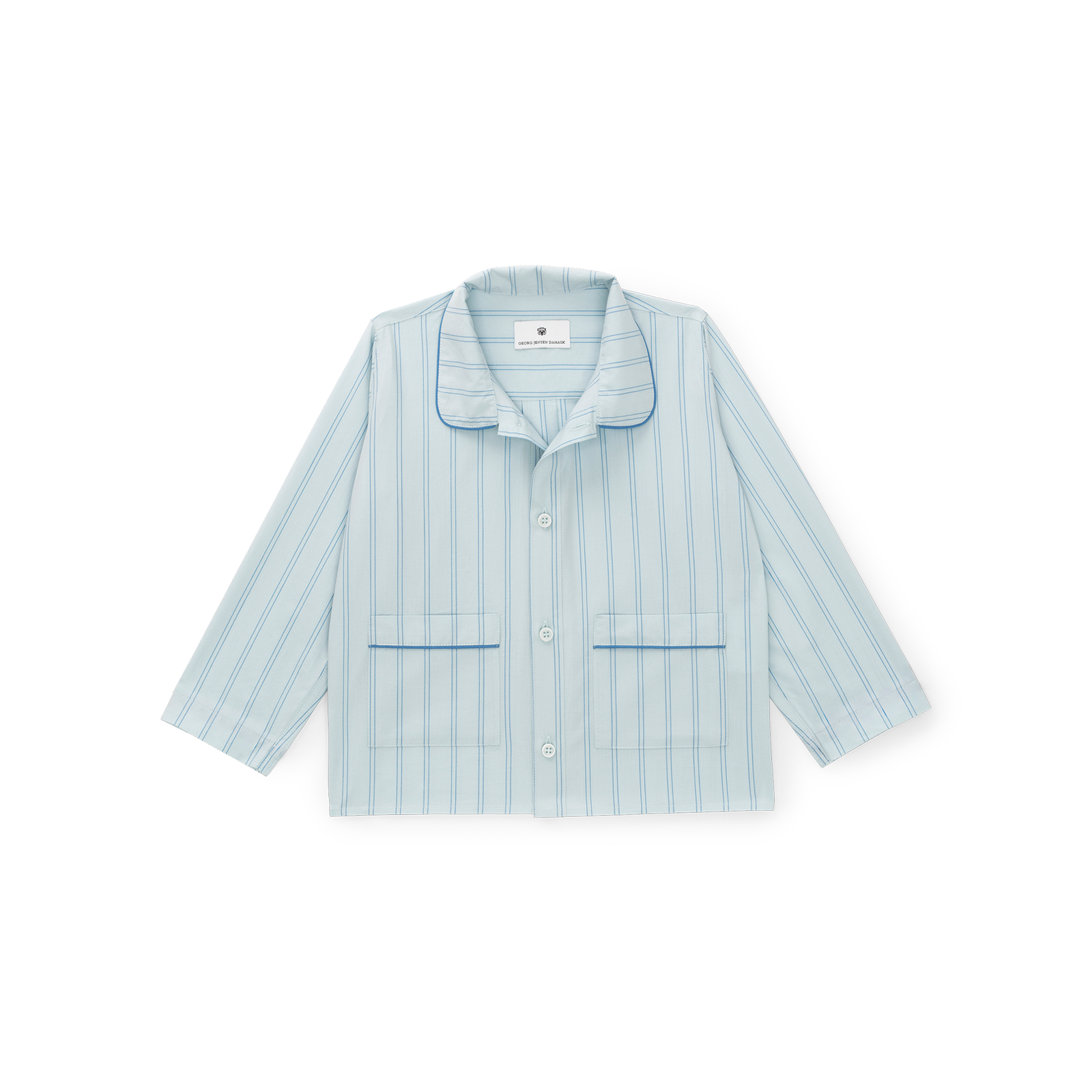Unisex pyjamas til børn percalevævet i supimabomuld. Pyjamassen har et klassisk snit, elegante pipings og slanke nålestriber i Bright Blue med en baggrund i farven Minimal Blue - en helt let variant af lyseblå med et strejf af aqua.