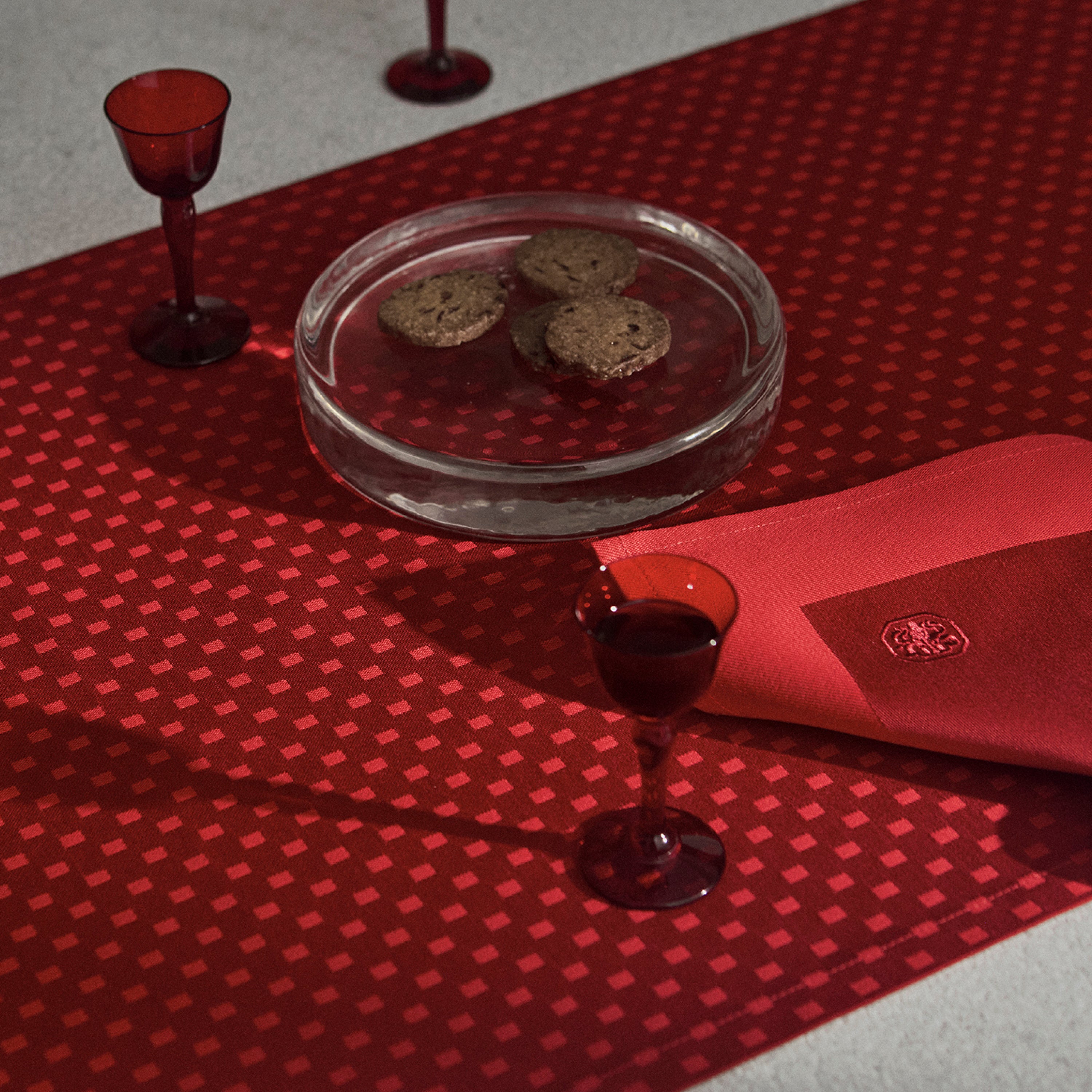 Med sine fine, stiliserede snefnug er den elegante bordløber med samme navn en evig klassiker i Georg Jensen Damasks kollektion. Tekstilkunstner Jette Nevers står bag det ikoniske, helt enkle design. Farven Deep Red understreger motivet på smukkeste vis.
