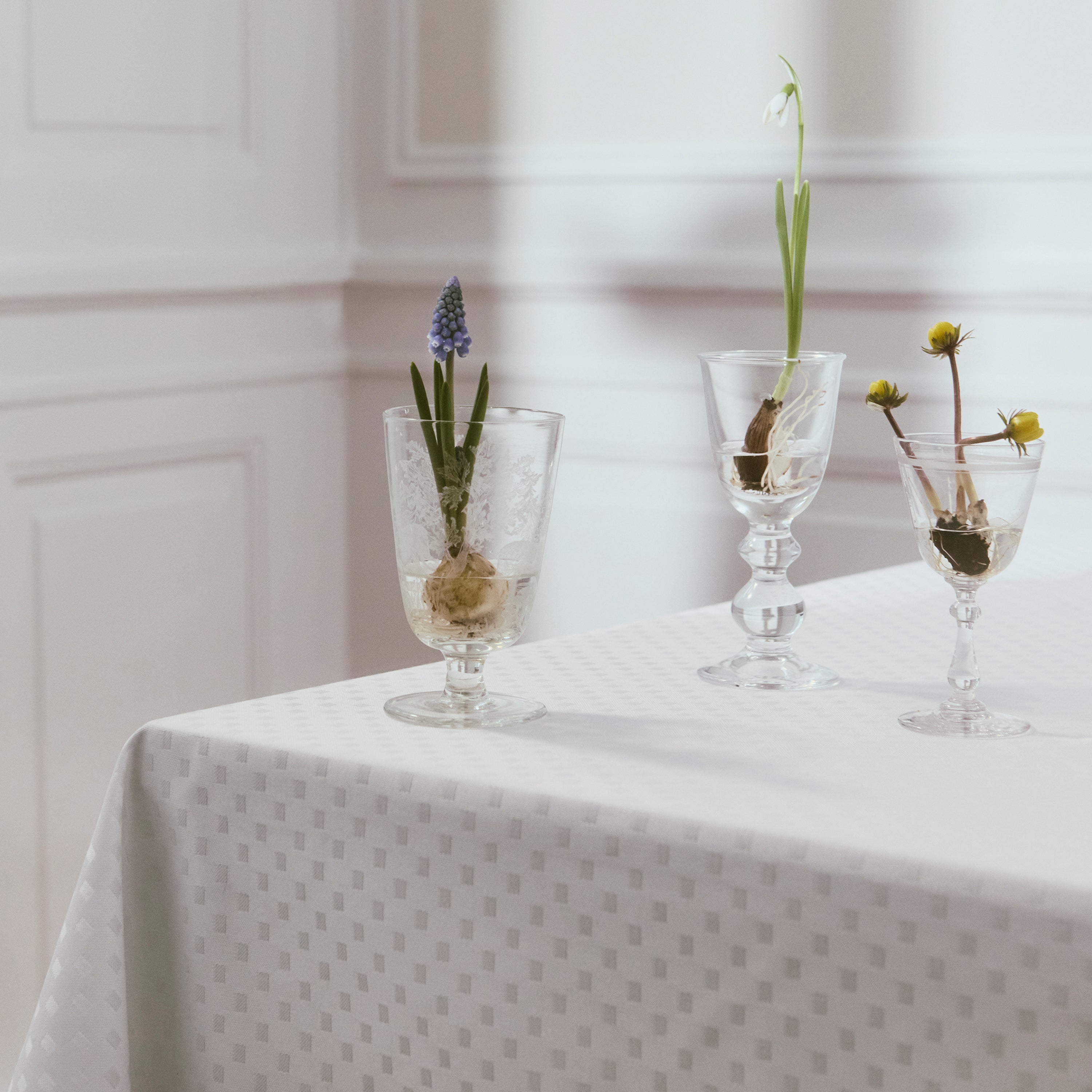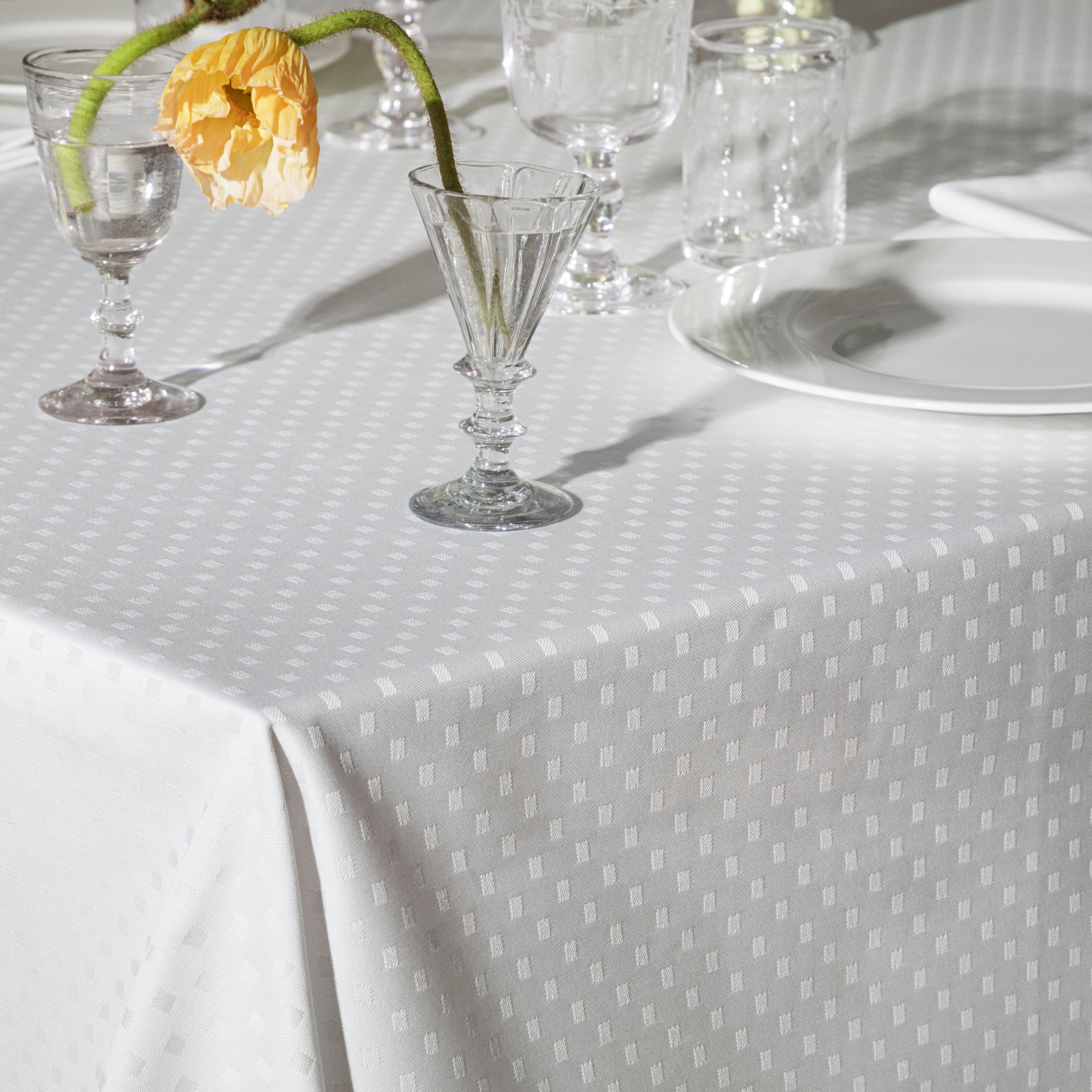 Tilbage står damaskdugen som et studie i hvidt. Et blankt lærred, der ikke kalder på en særlig indretningsstil, men fuldendes i opdækningen med tilbehør efter humør, årstid og måltid.