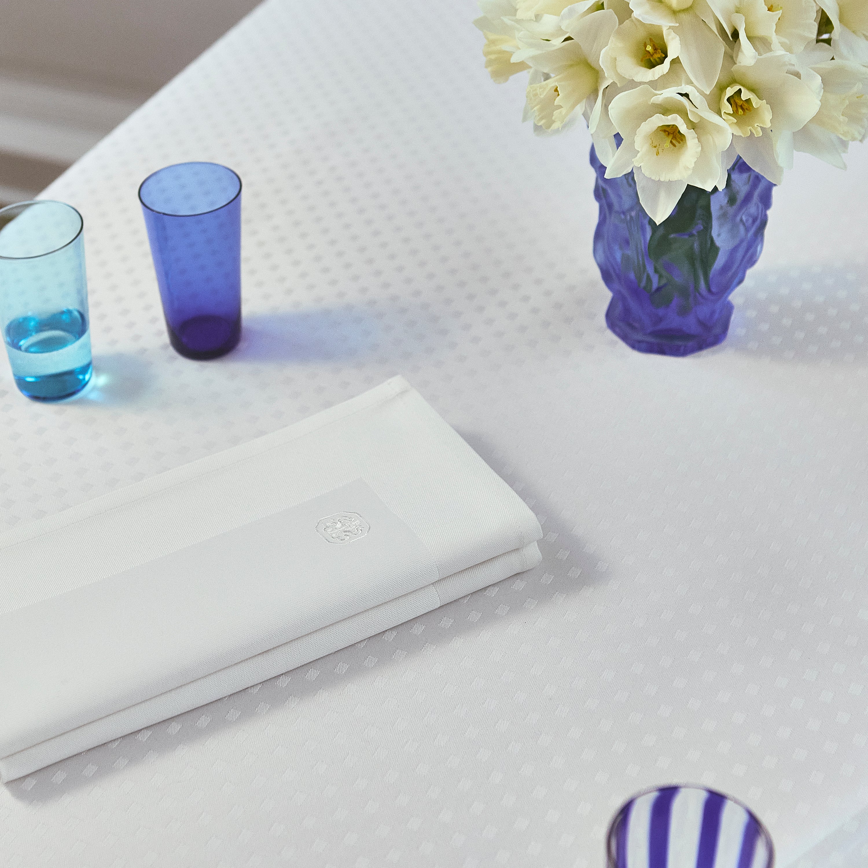 Tilbage står damaskdugen som et studie i hvidt. Et blankt lærred, der ikke kalder på en særlig indretningsstil, men fuldendes i opdækningen med tilbehør efter humør, årstid og måltid.