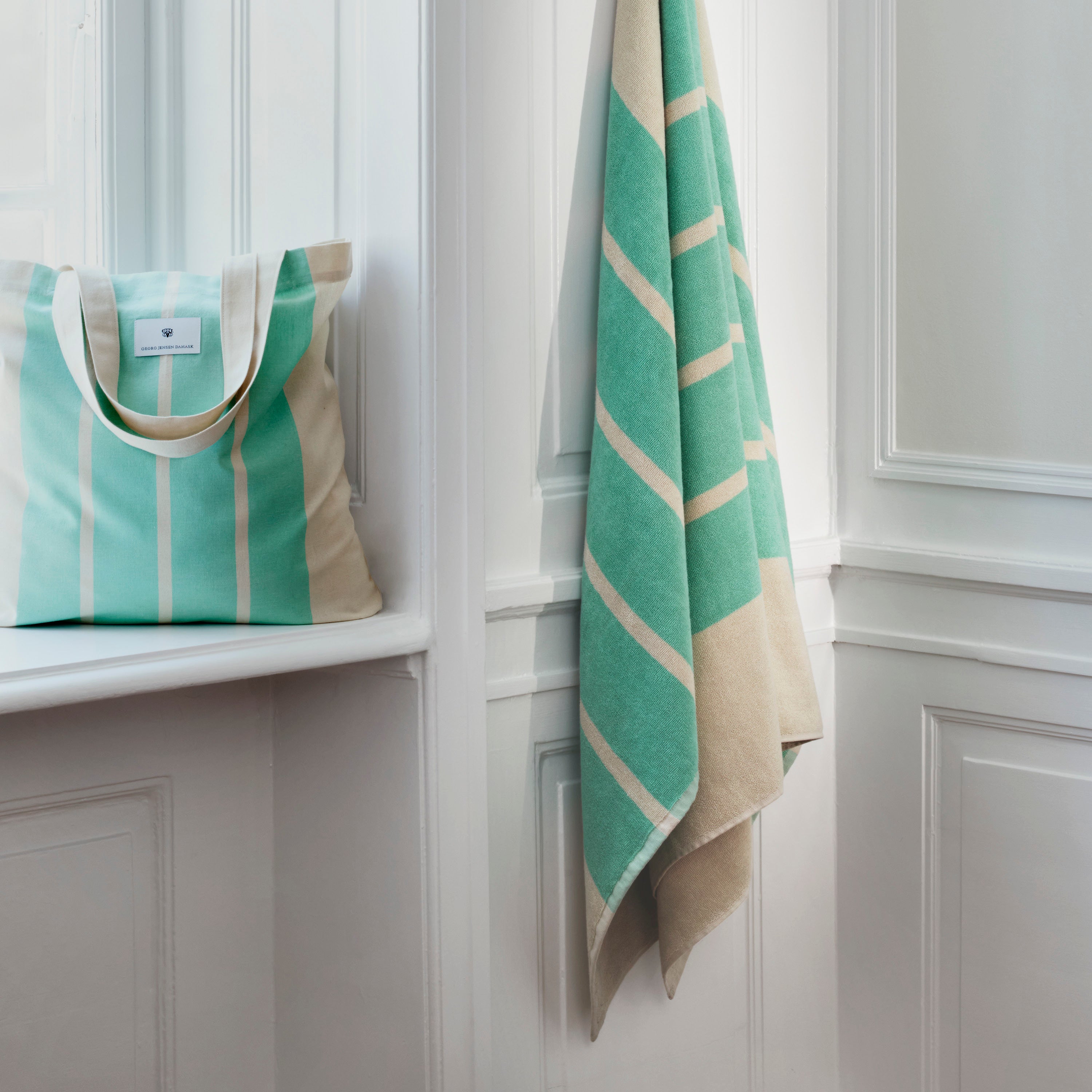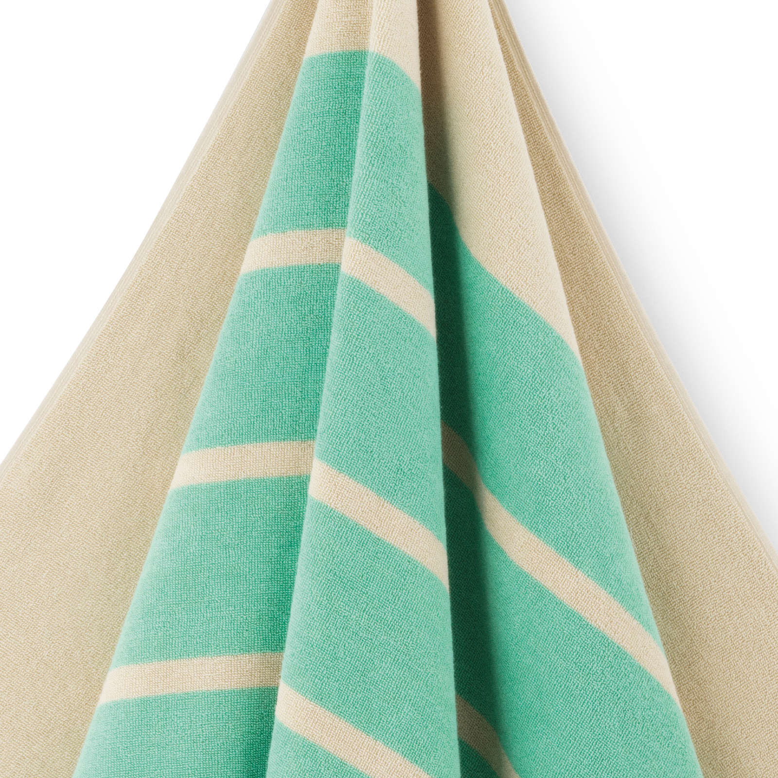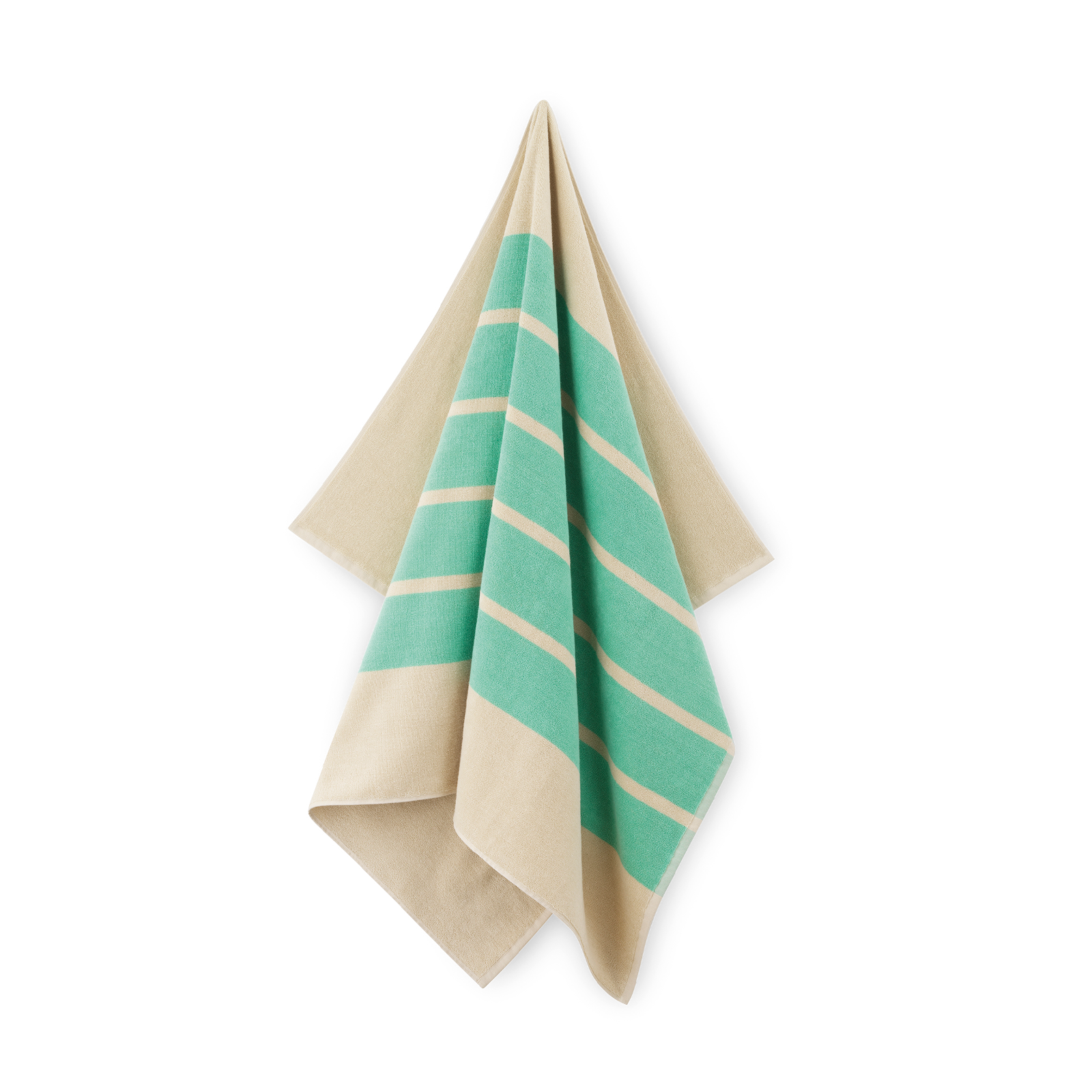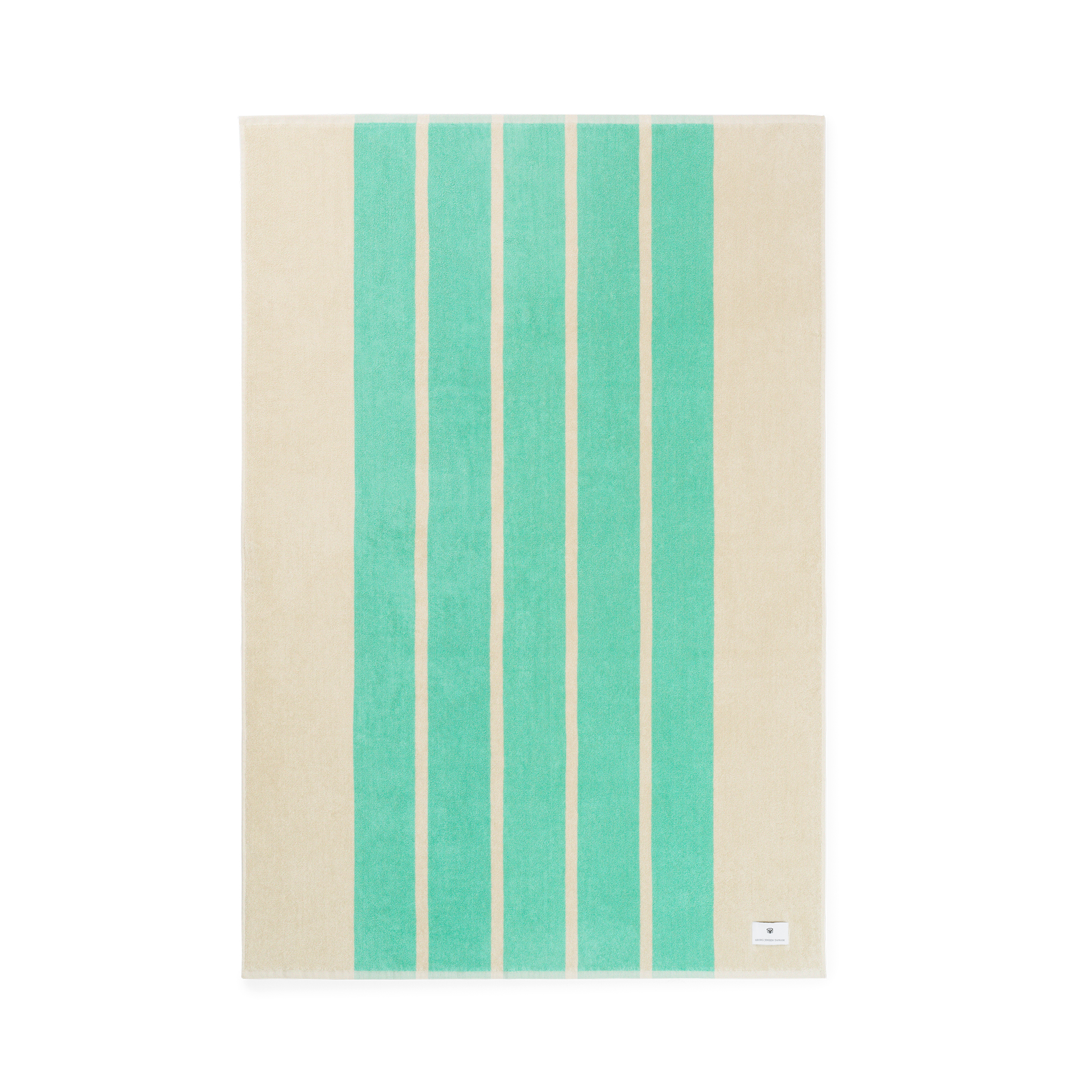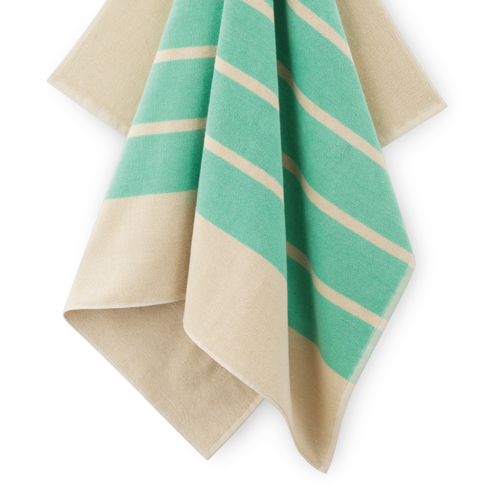 Klassisk badelagen i blød frotté med grønne striber på en sandfarvet bund. Badelagnet er vævet i 100 % dobbelttvundet og kæmmet bomuld, der giver en blød og glansfuld overflade.