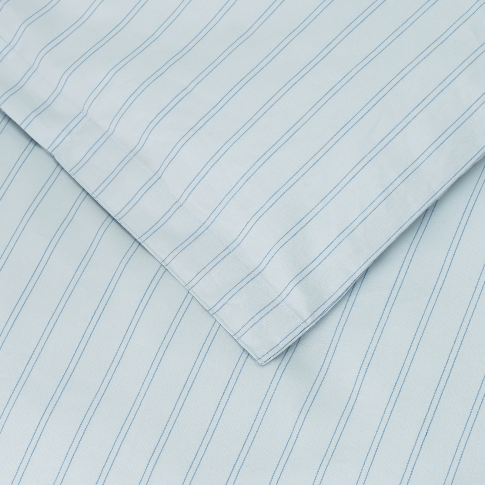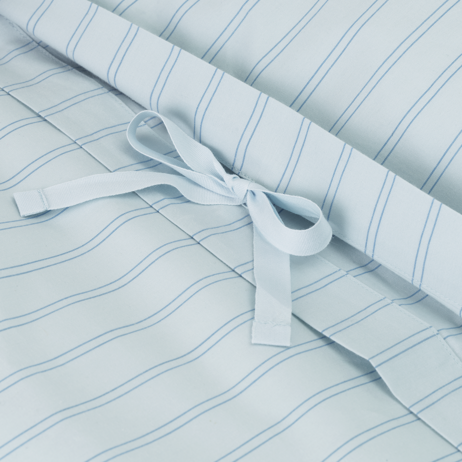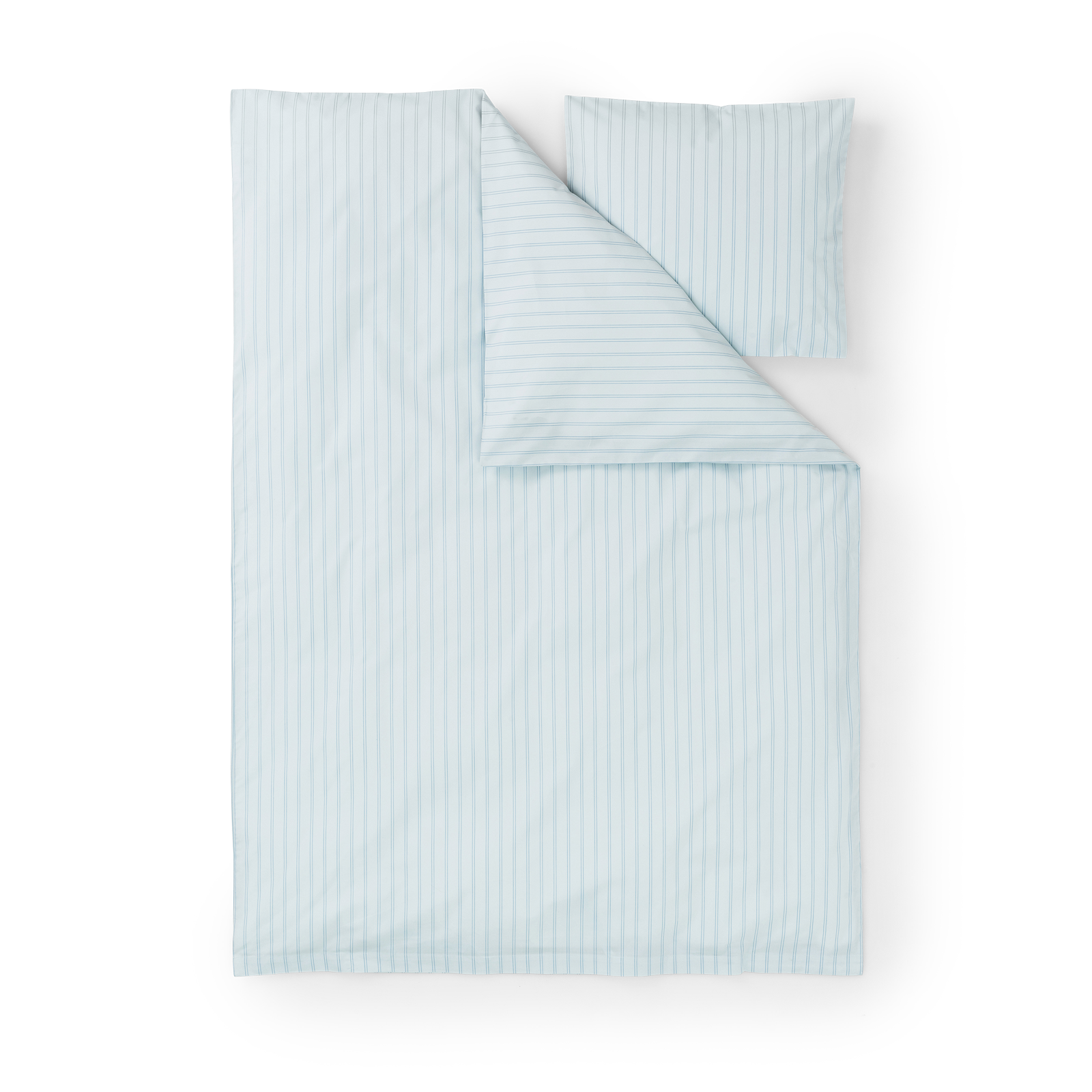 Supima Percale Pinstripe sengesæt til børn har slanke nålestriber i Bright Blue med en baggrund i farven Minimal Blue – en helt let variant af lyseblå med et strejf af aqua.