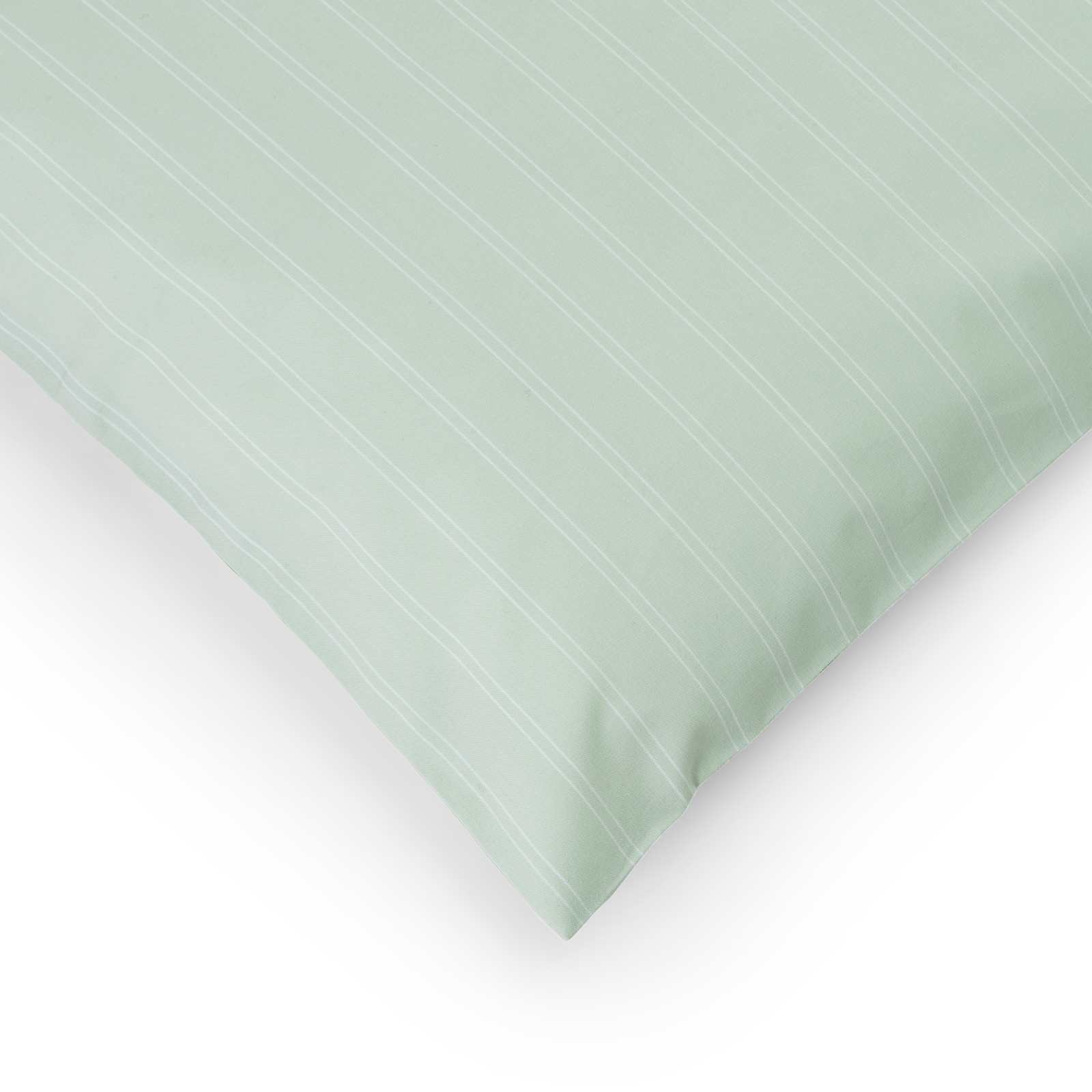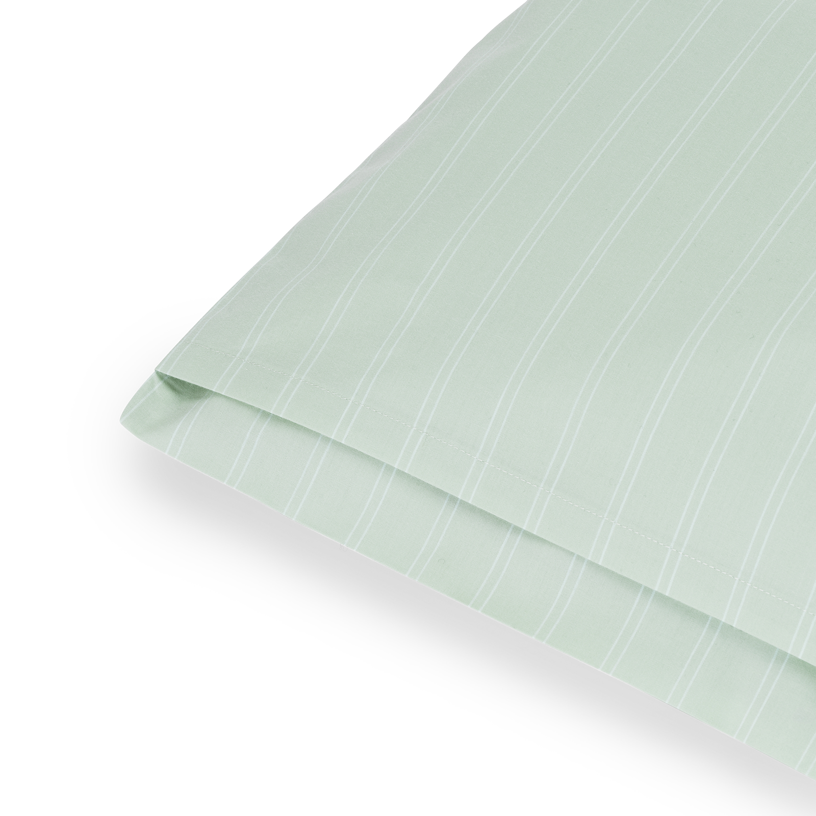 Supima Percale Pinstripe hovedpudebetrækket har slanke, hvide nålestriber med en baggrund i farven Glass Green – en klar, grønblå nuance, der er inspireret af farven på råglas.
