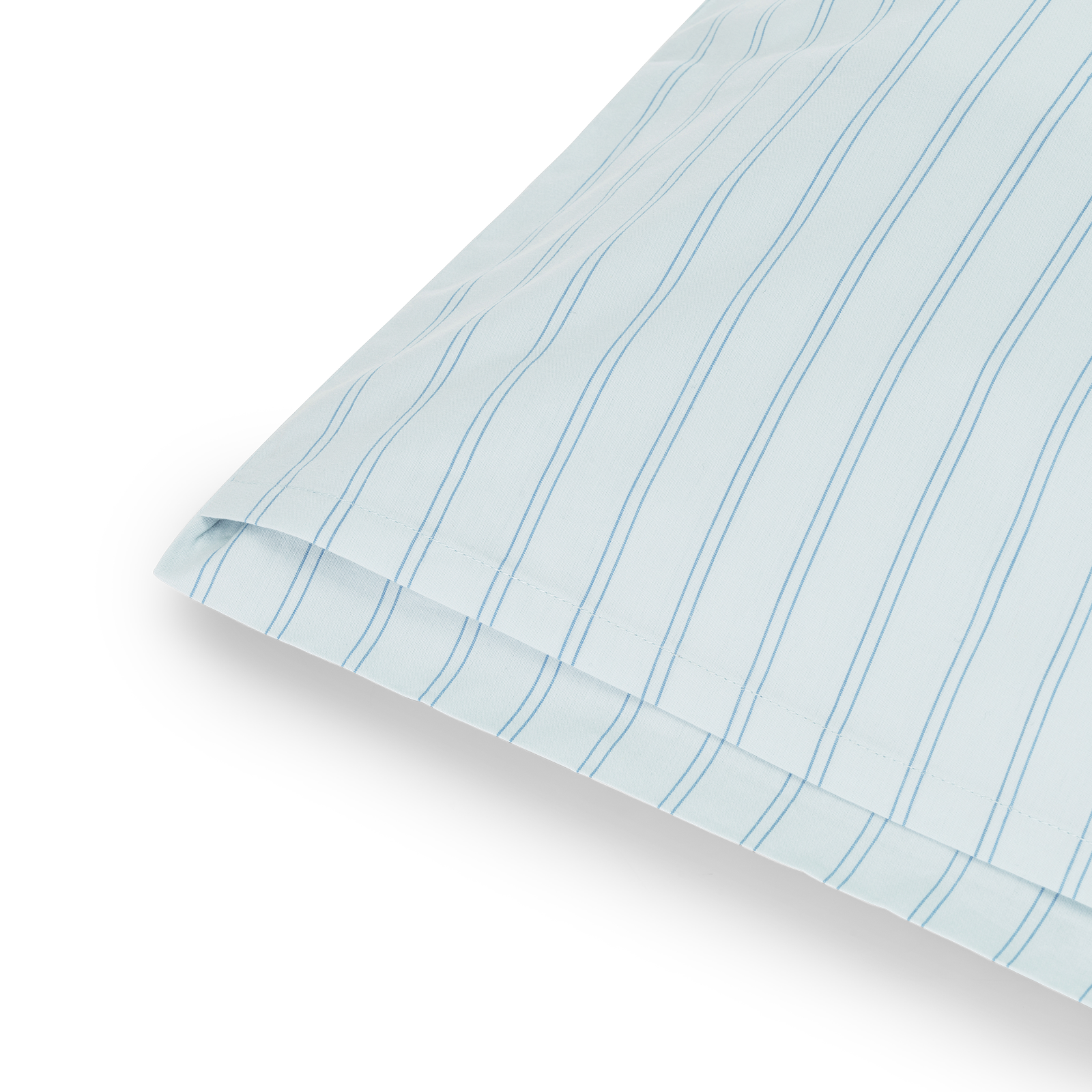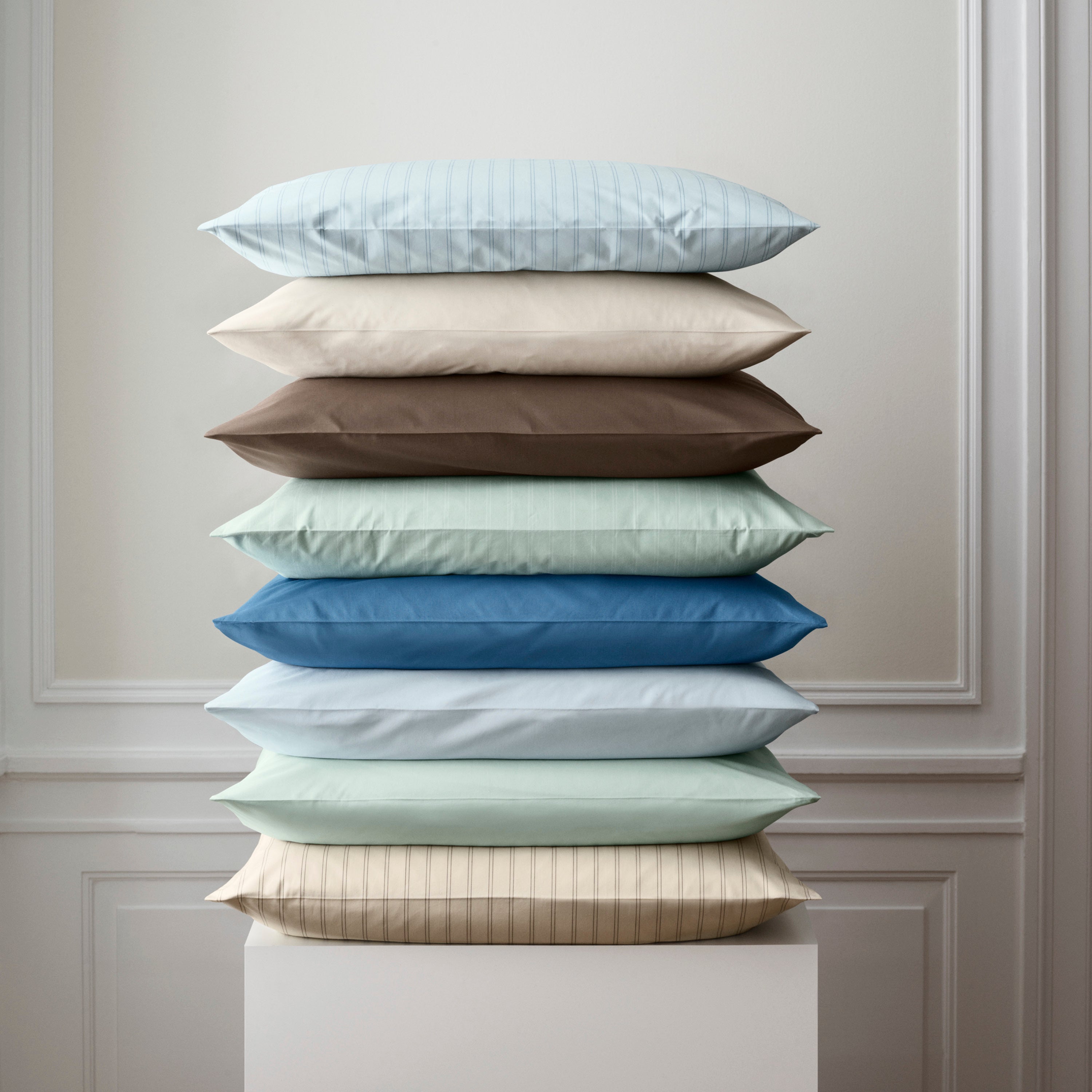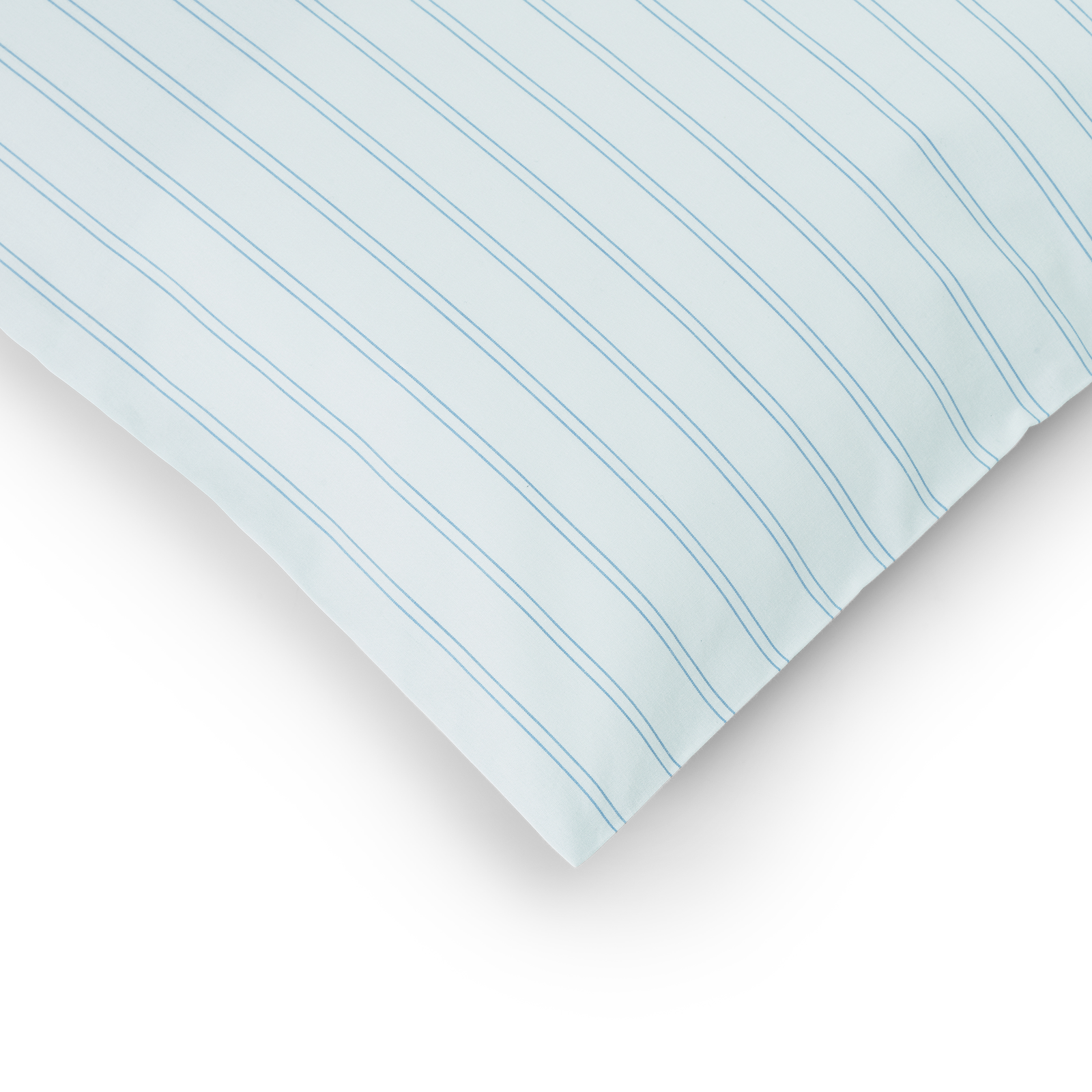 Supima Percale Pinstripe hovedpudebetrækket har slanke nålestriber i Bright Blue med en baggrund i farven Minimal Blue – en helt let variant af lyseblå med et strejf af aqua.