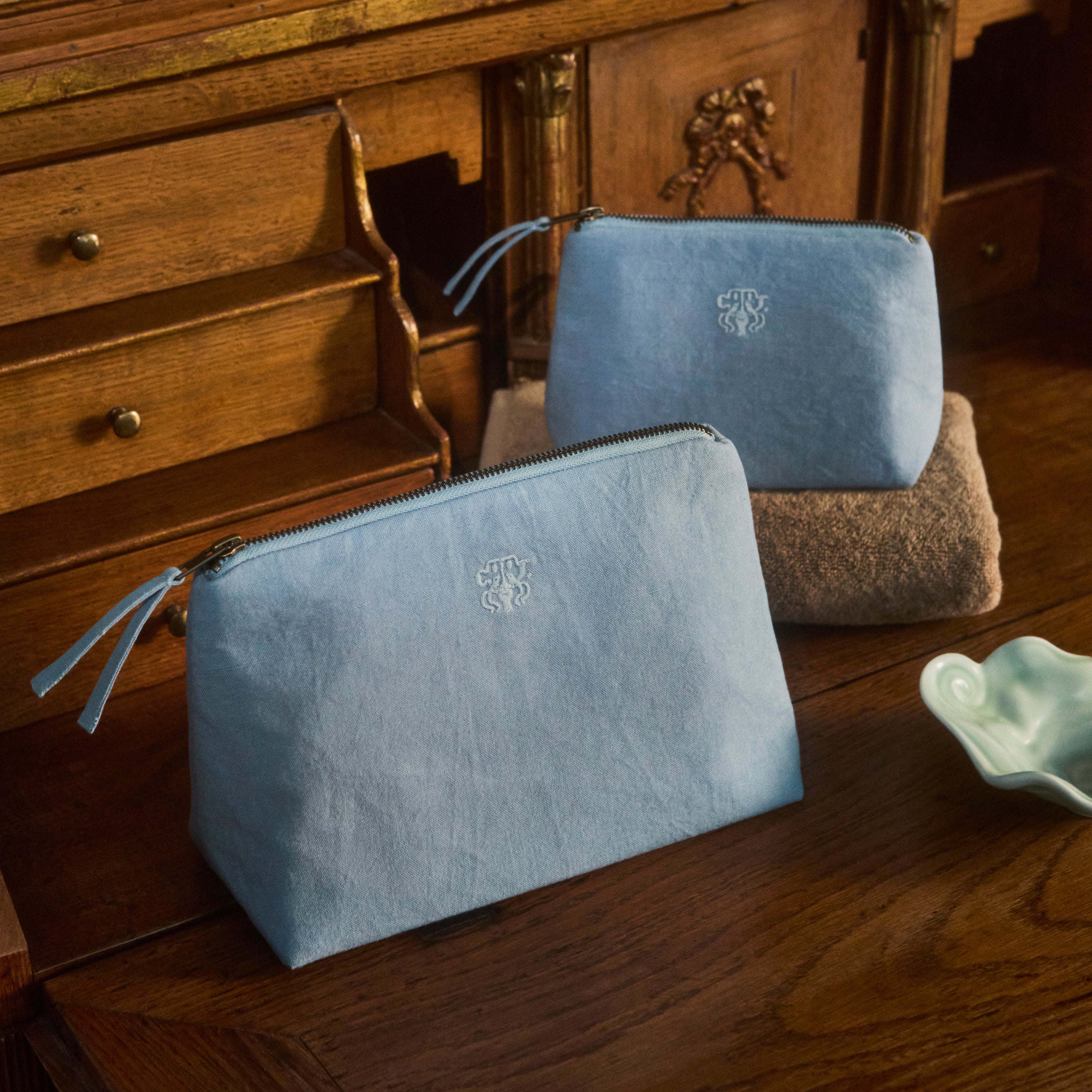 Funktionel og rummelig toilettaske i et tidløst design. All toilettasken er vævet i 100 % bomuld med en indre lomme og har Georg Jensen Damasks logo broderet som elegant detalje. Farven Blue Hour er en smuk og tidløs, mellemblå farve.