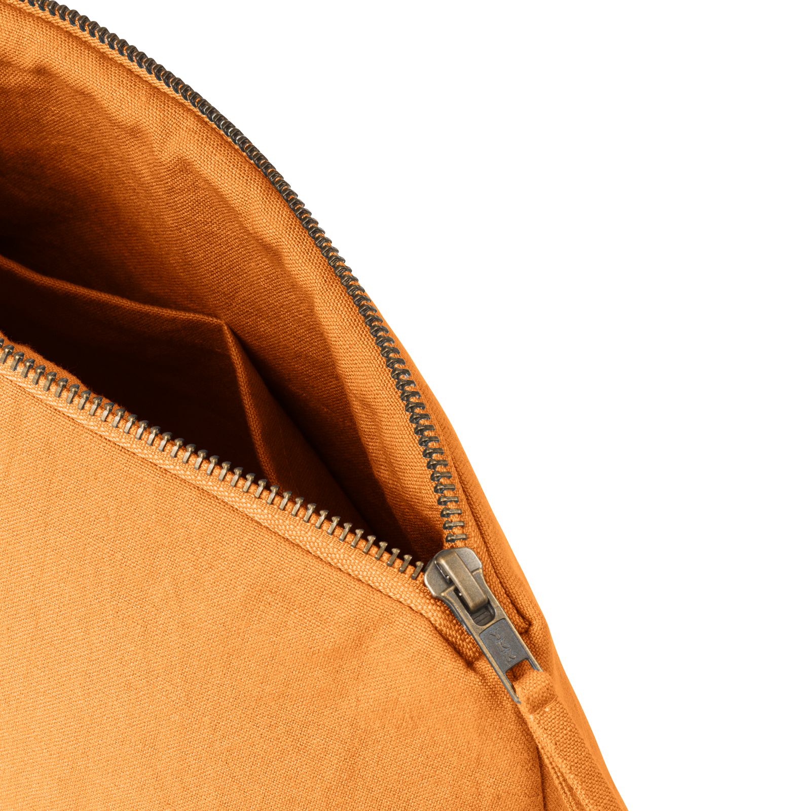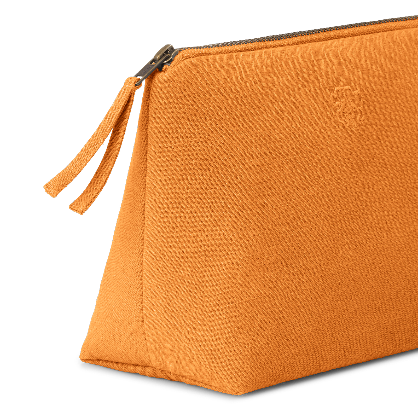 Funktionel og rummelig toilettaske i et tidløst design. All toilettasken er vævet i 100 % bomuld med en indre lomme og har Georg Jensen Damasks logo broderet som elegant detalje. Farven Chanterelle er en dyb orange med undertoner af karamel – inspireret af kantarellens smukke nuancer.