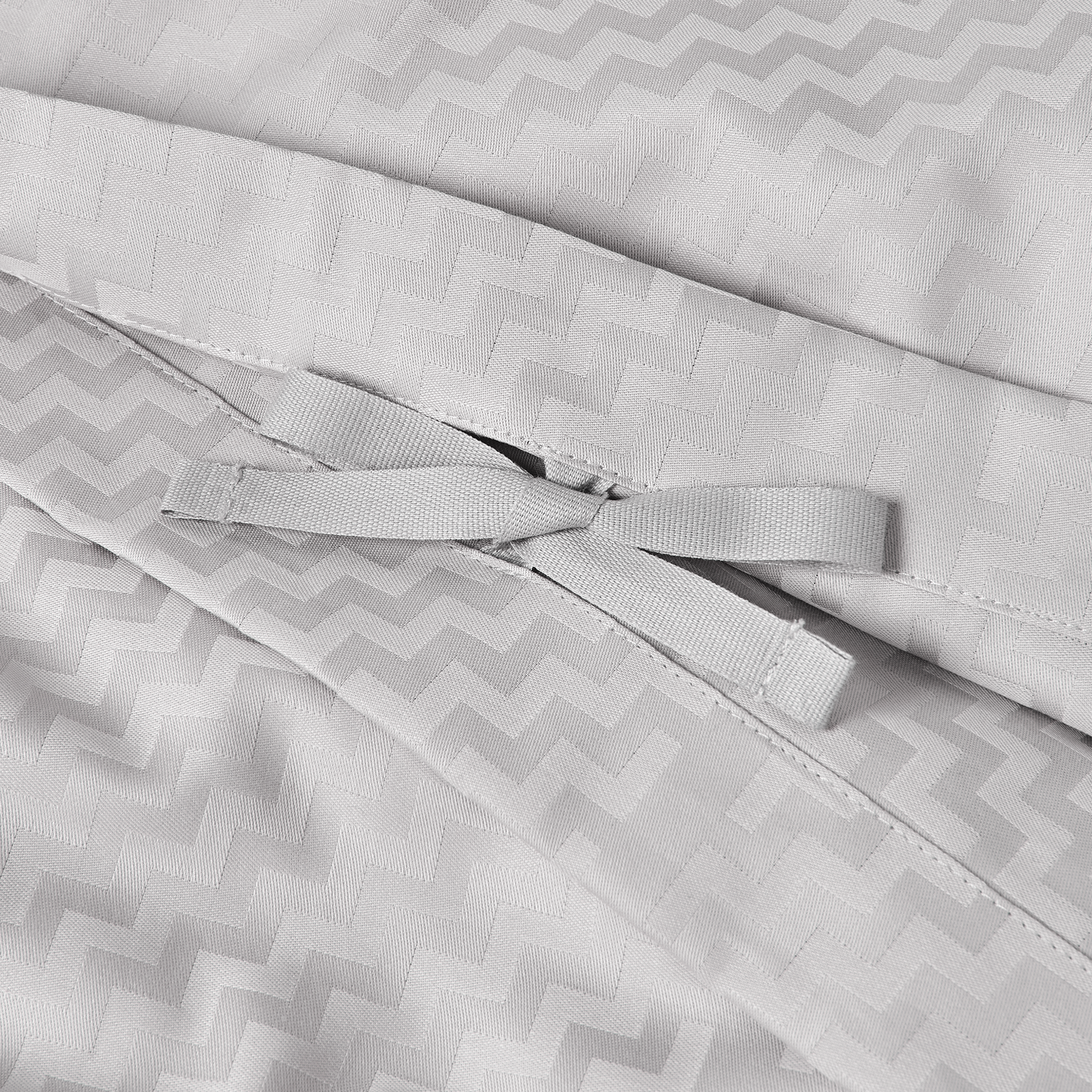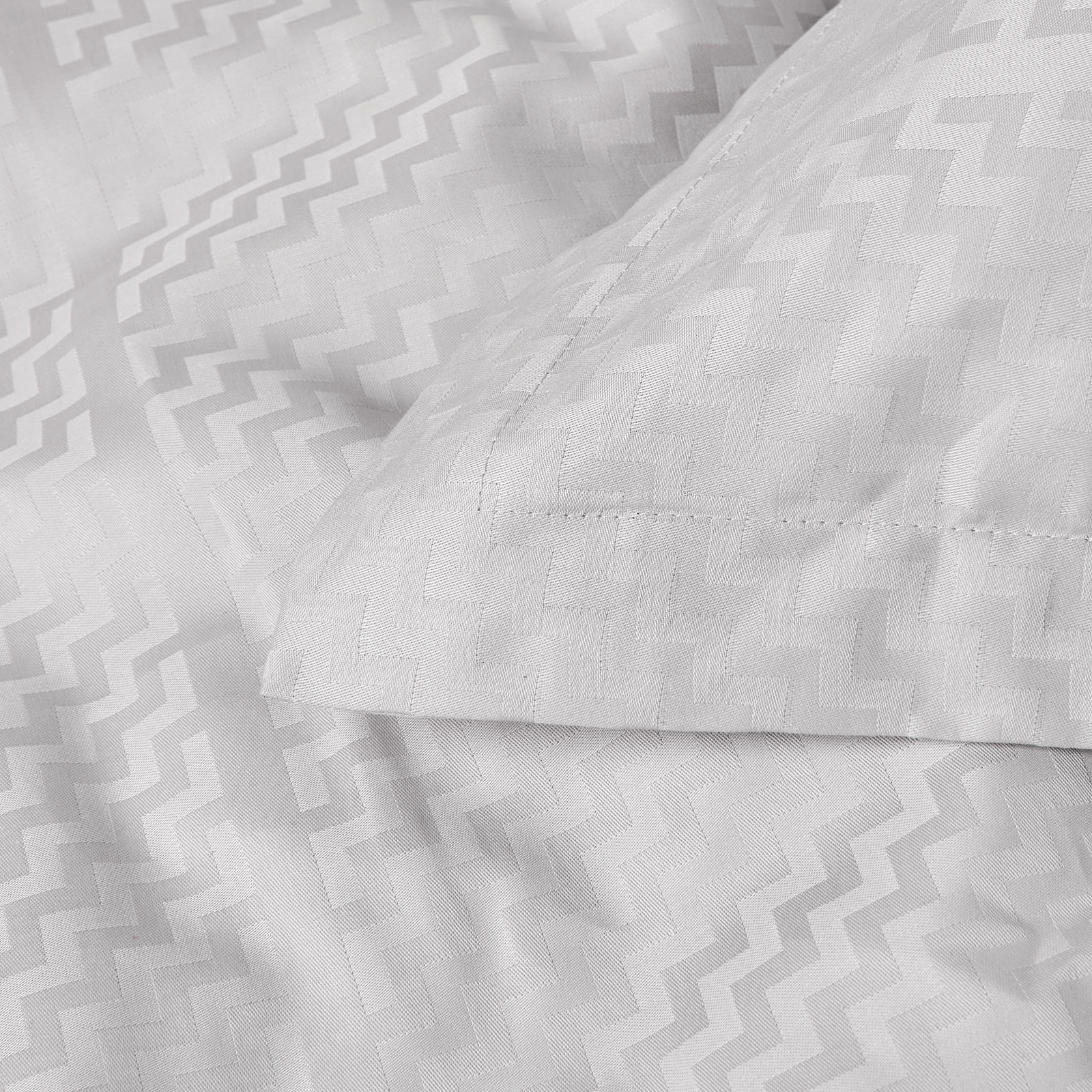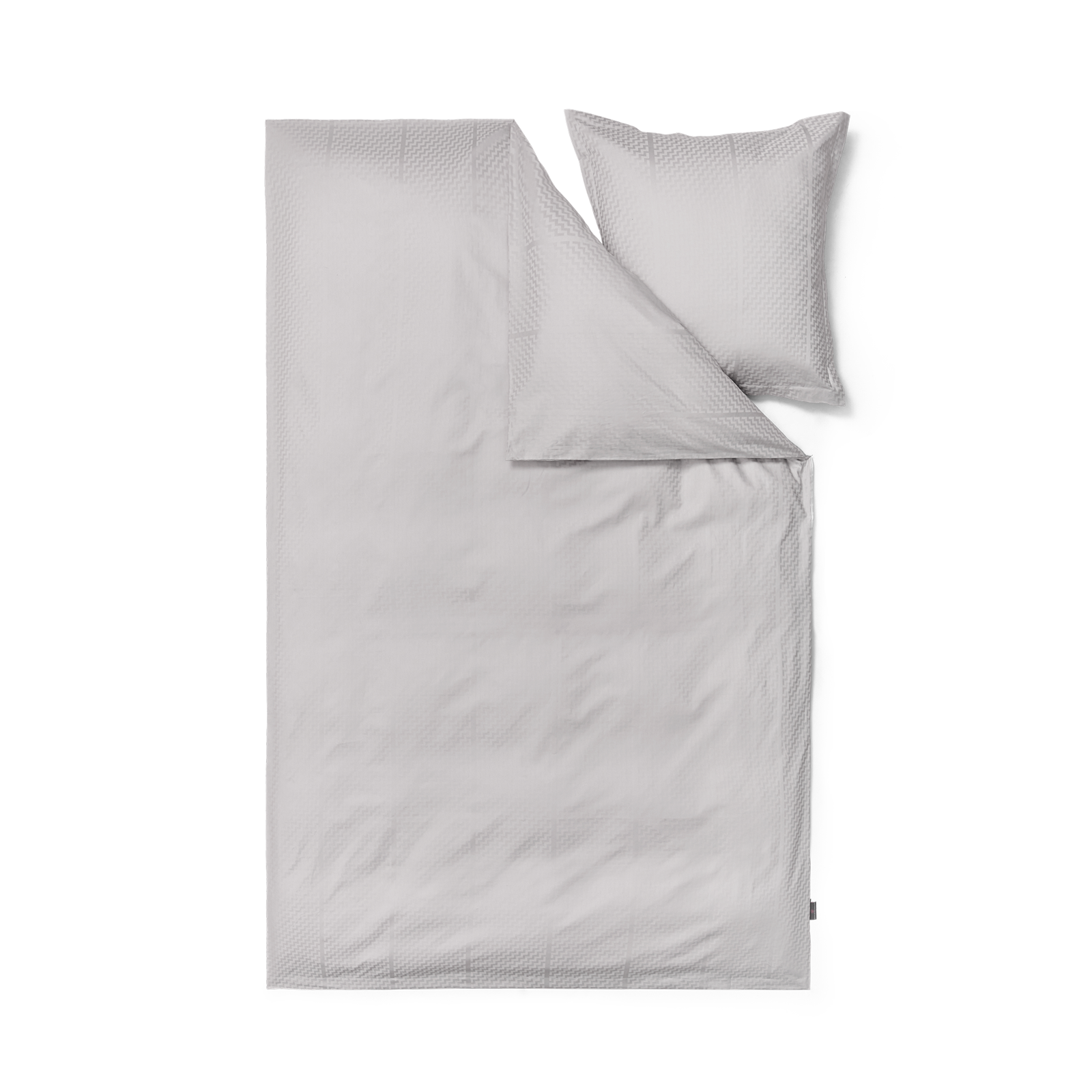 Tripp-designets geometriske mønster er udformet som en trappe, der gentages og blot brydes af en vertikal streg. Helt enkelt og harmonisk. Mønsteret på sengetøjet træder smukt frem i damaskvævningen og bliver fremhævet yderligere af den elegante lysegrå farve, Silver Cloud.