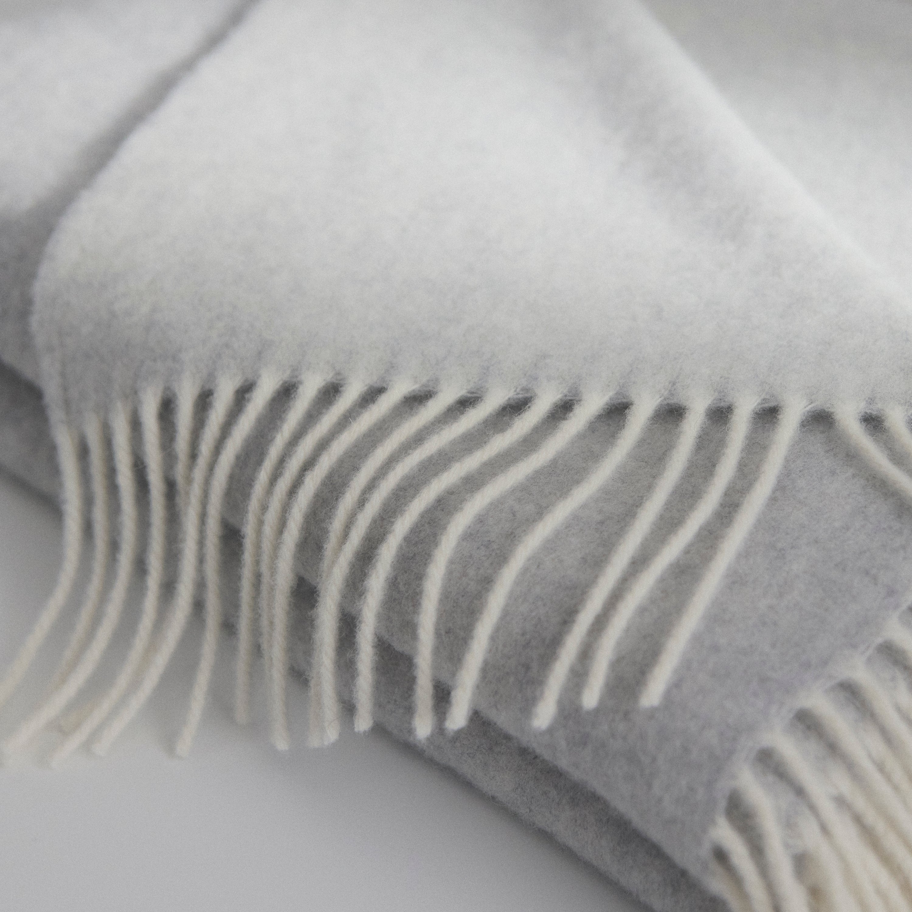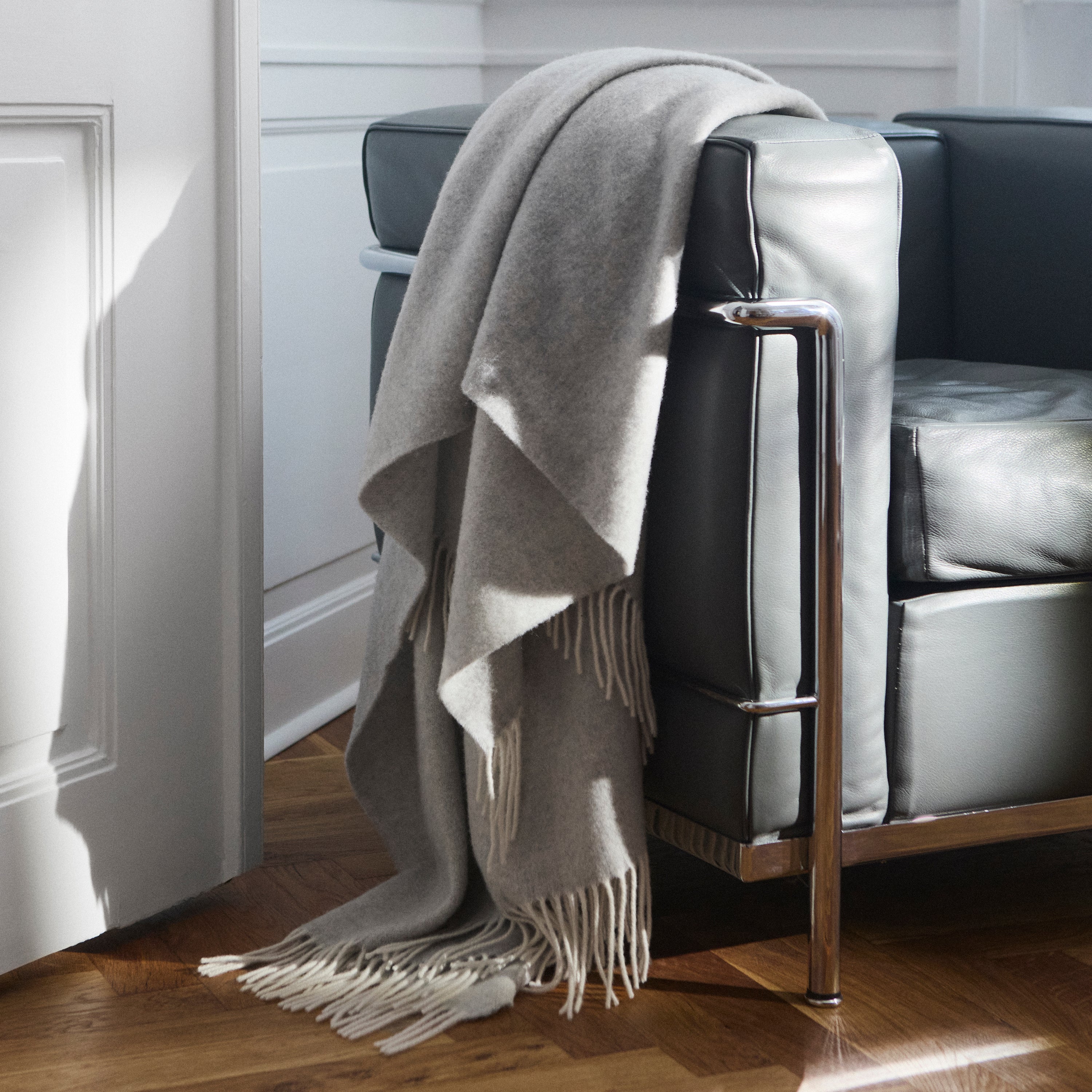 Union-plaidens fine kvalitet i merinould og cashmere giver en smuk overflade og en helt særlig blødhed. Med en diskret nuanceforskel af lysegrå på for- og bagside har plaiden et helt enkelt udtryk.