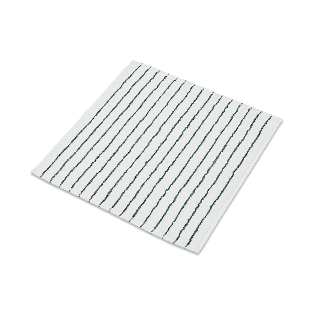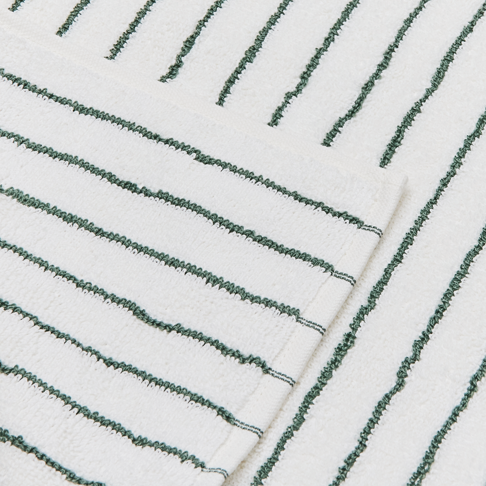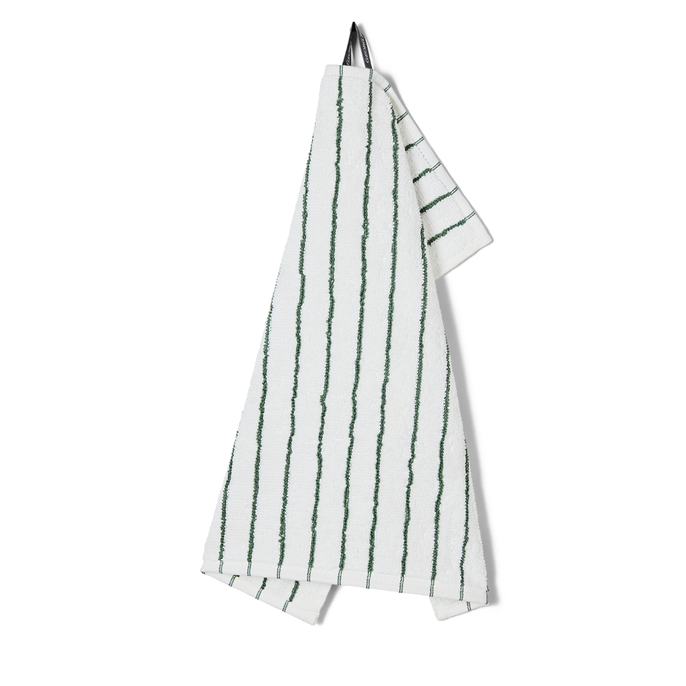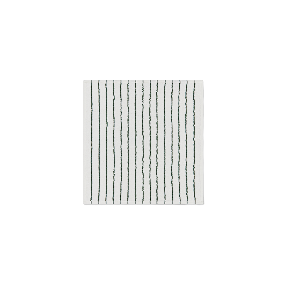 De smalle mørkegrønne og hvide striber giver vaskekluden et moderne udtryk. De stribede vaskeklude er smukke alene – eller kombineret med ensfarvet frotté. Vores frotté bliver bedre og bedre, jo mere det bliver brugt.